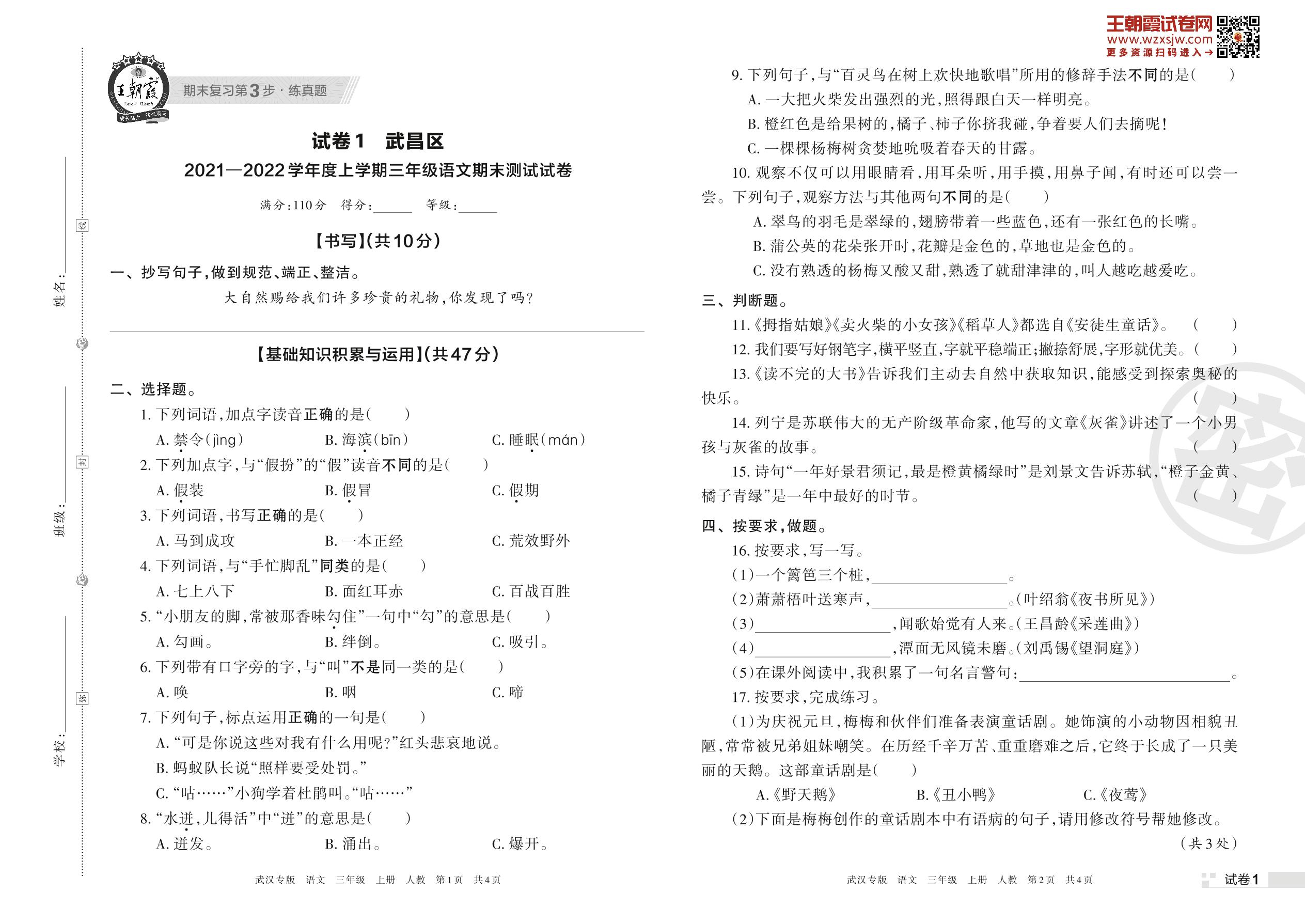 武昌区2021—2022学年度上学期三年级语文期末测试试卷(人教版)【1】