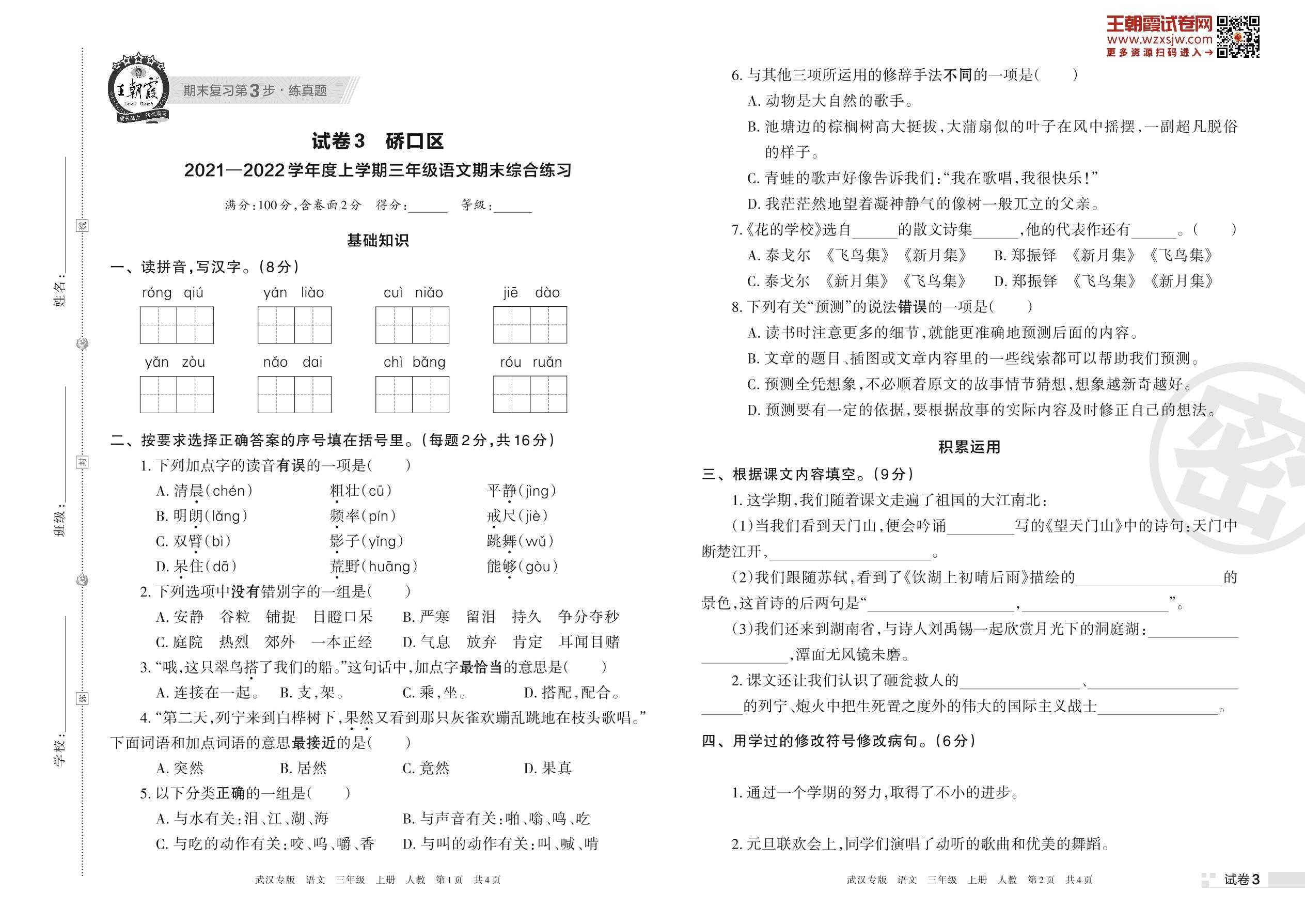 硚口区2021—2022学年度上学期三年级语文期末综合练习(人教版)【3】
