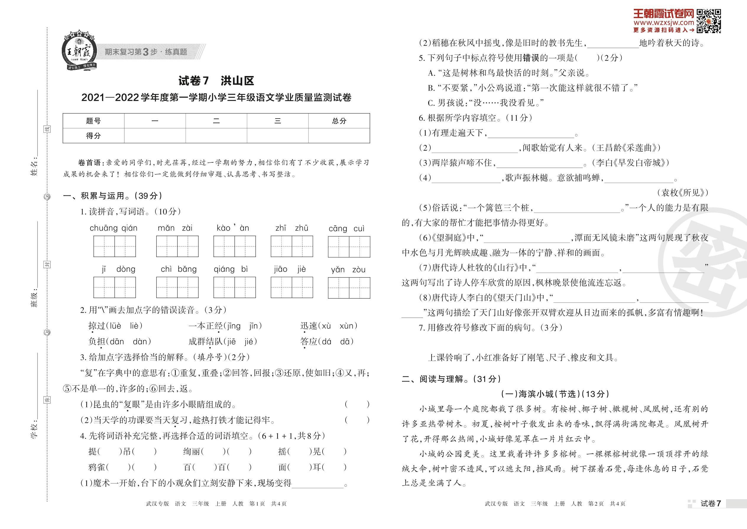 洪山区2021—2022学年度第一学期三年级语文学业质量监测试卷(人教版)【7】