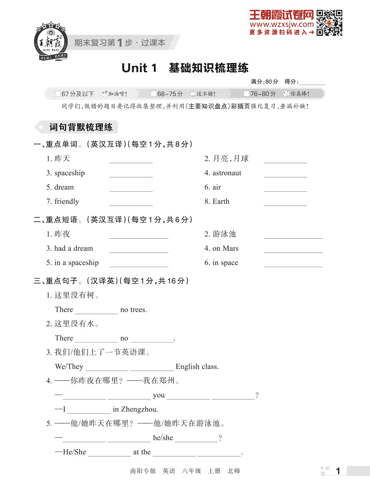 王朝霞期末过课本——Unit 1 基础知识梳理练六年级上册英语(北师版)