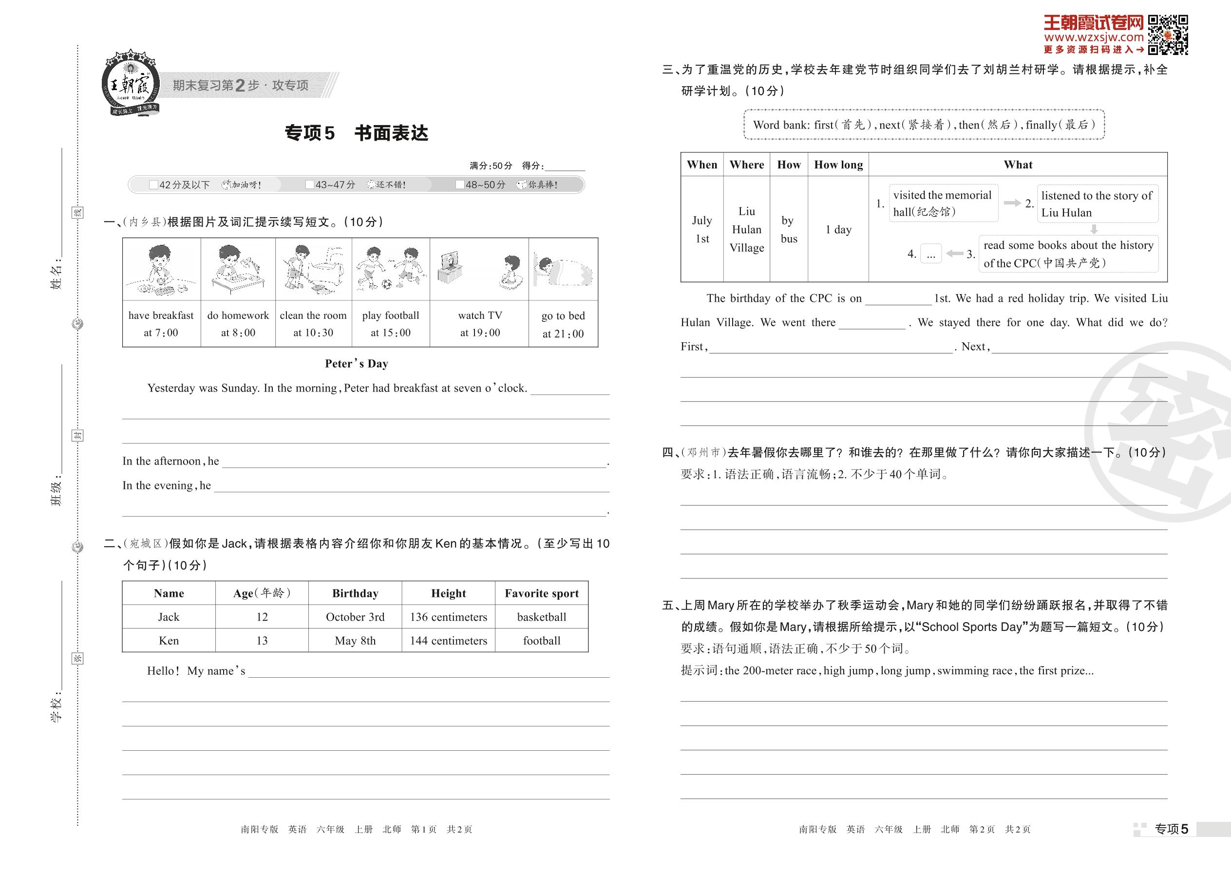 王朝霞期末专项卷——书面表达六年级上册英语(北师版)【5】