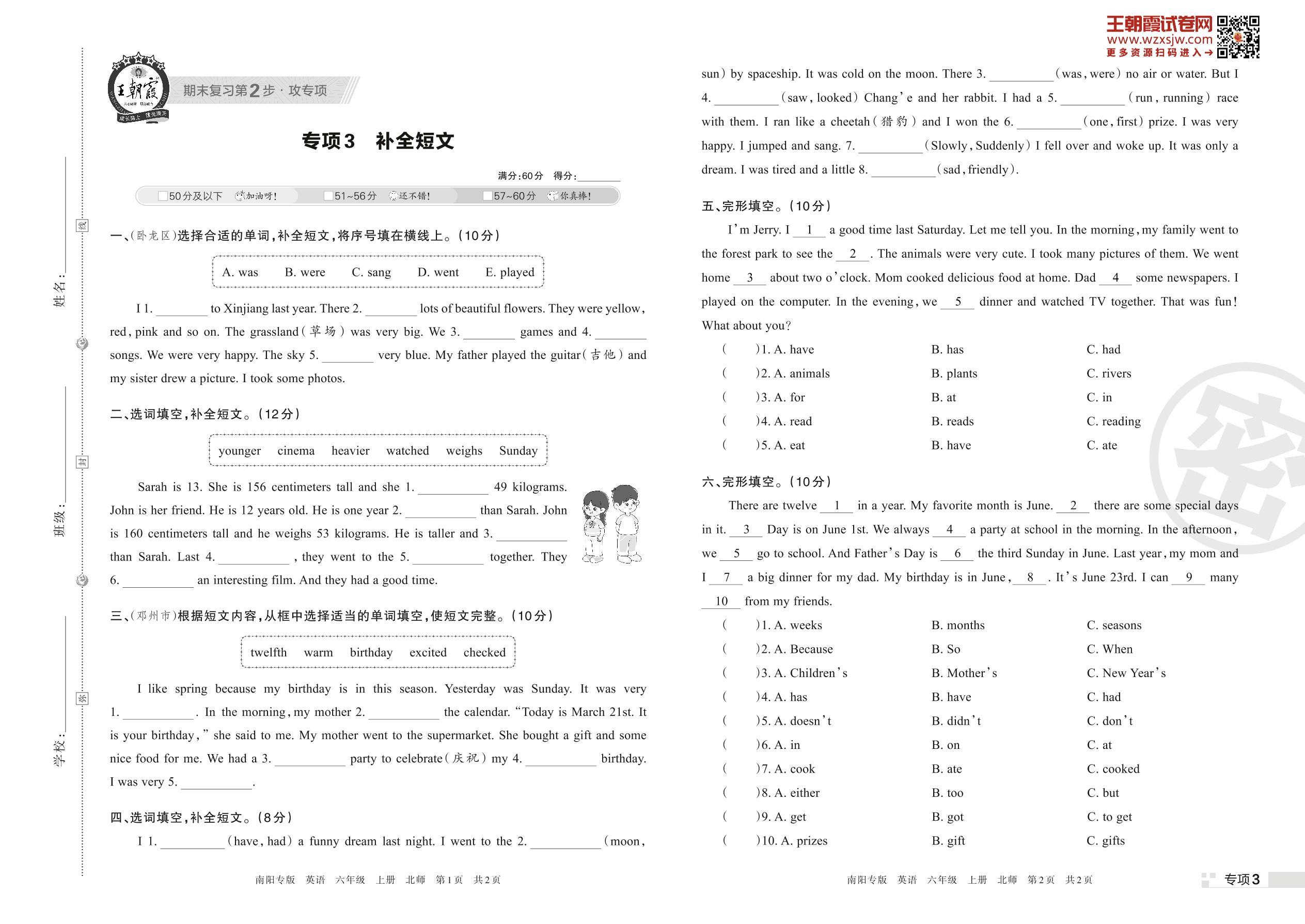 王朝霞期末专项卷——补全短文六年级上册英语(北师版)【3】