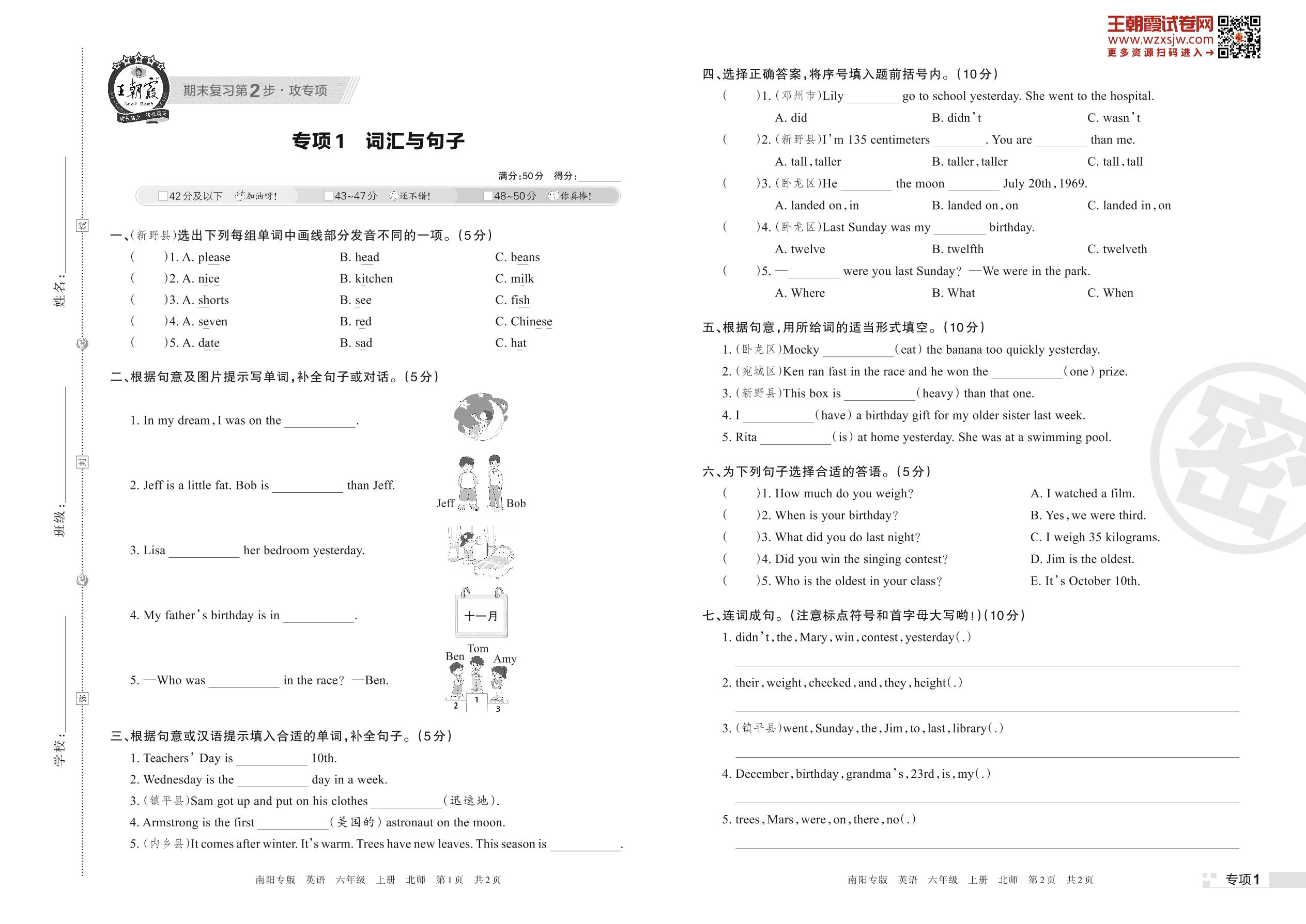 王朝霞期末专项卷——词汇与句子六年级上册英语(北师版)【1】