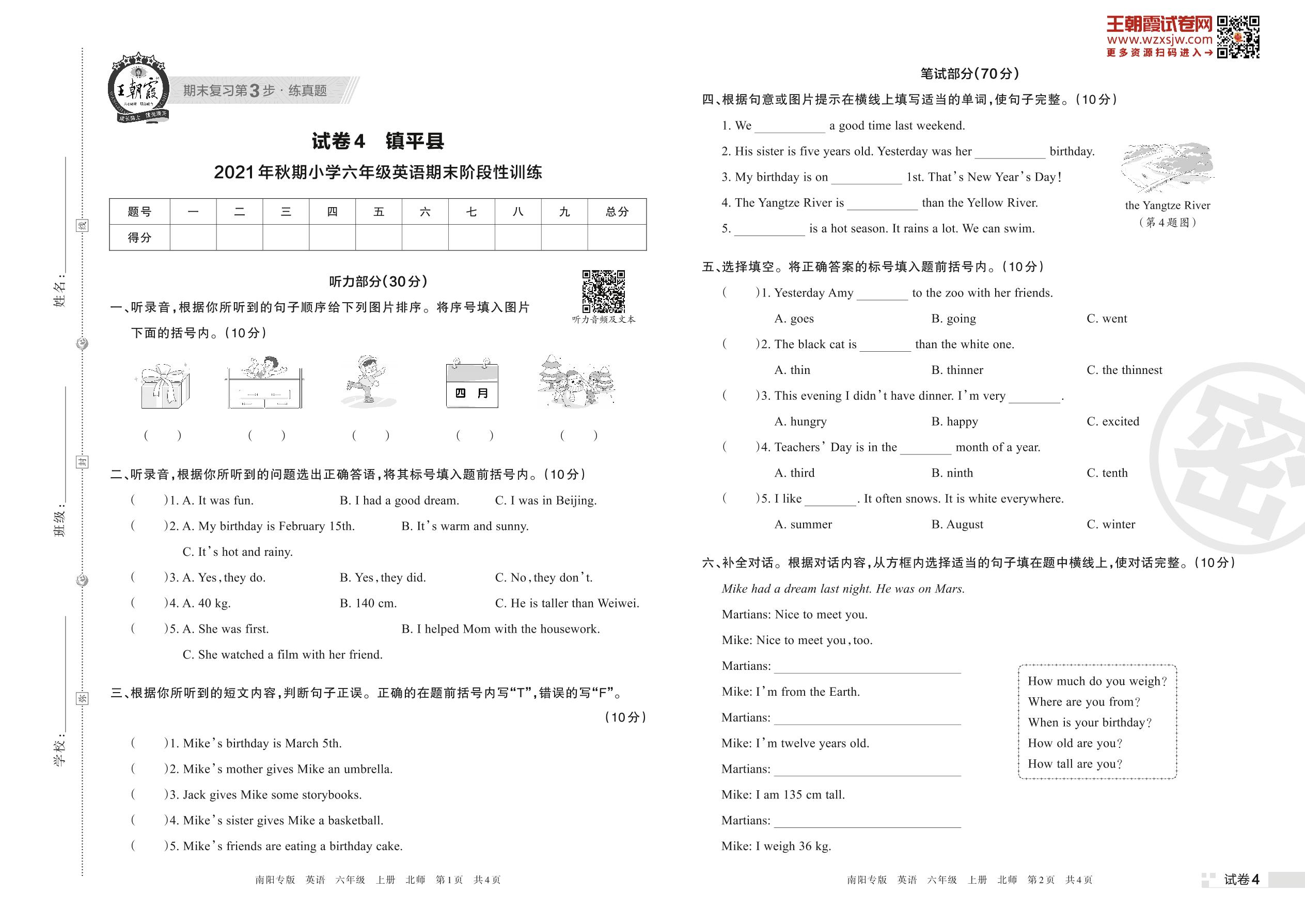镇平县2021年秋期小学六年级英语期末阶段性训练(北师版)【4】