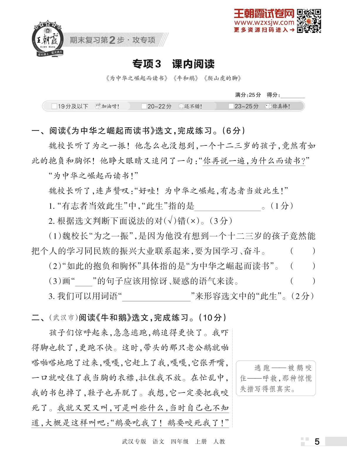 王朝霞期末专项卷——课内阅读四年级上册语文(人教版)_R221123151502955【3】