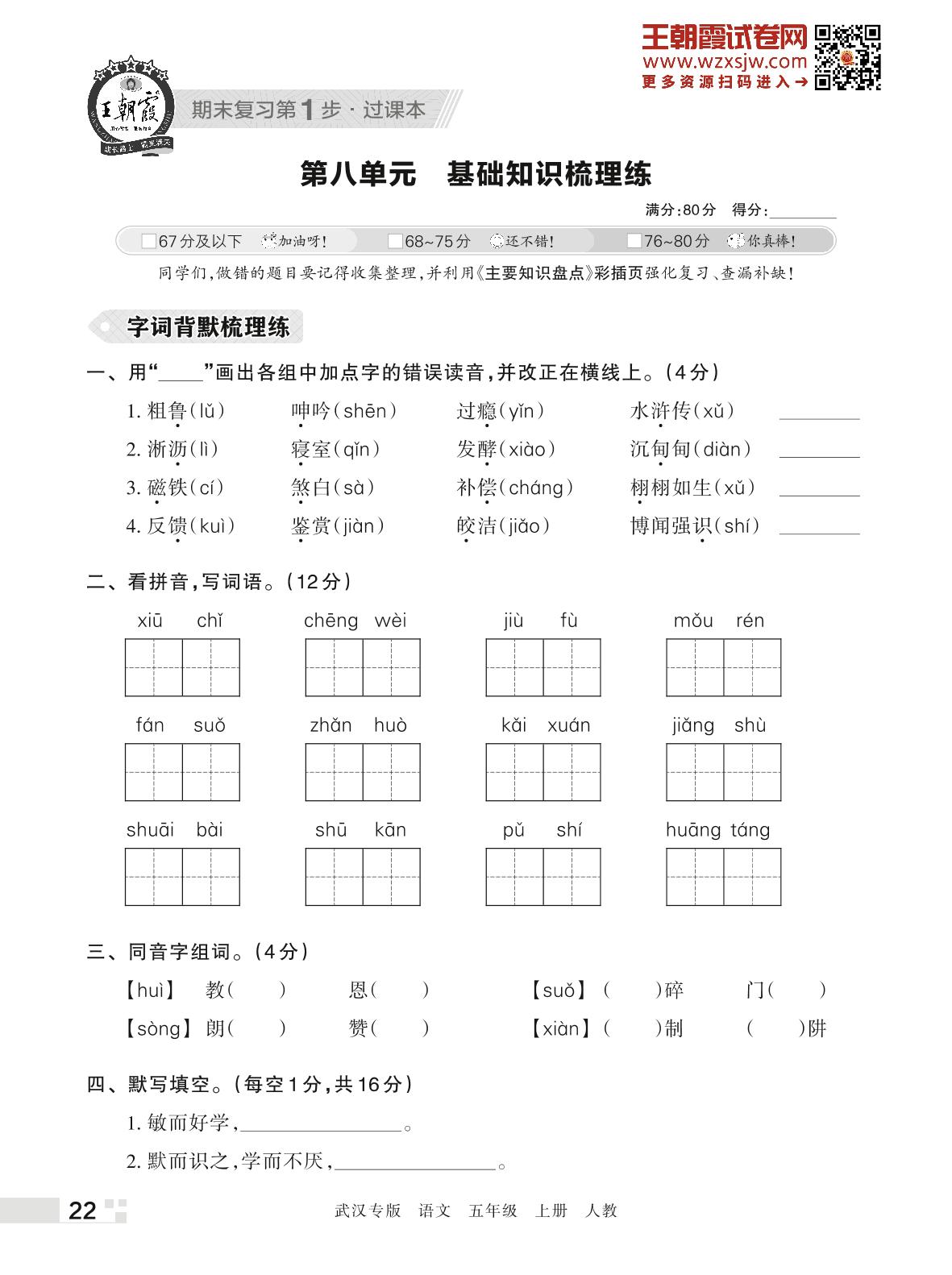 王朝霞期末过课本——第八单元 基础知识梳理练五年级上册语文(人教版)_R221123152106921