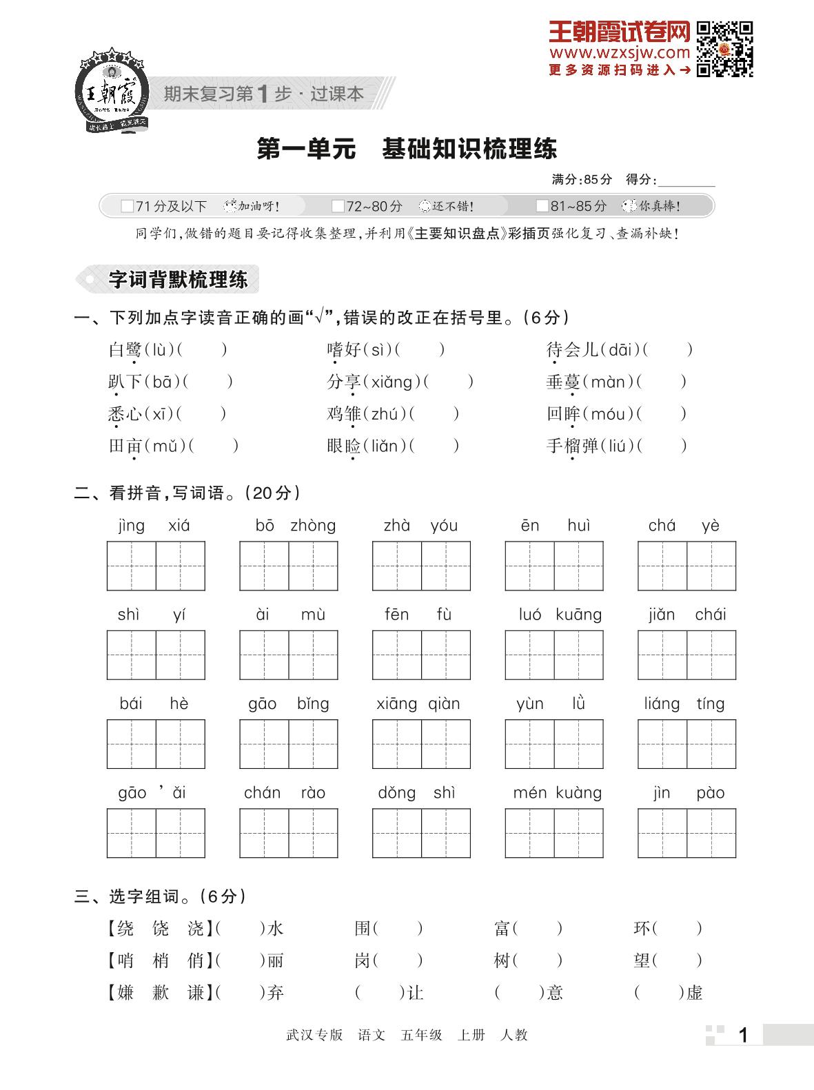 王朝霞期末过课本——第一单元 基础知识梳理练五年级上册语文(人教版)_R221123152106352