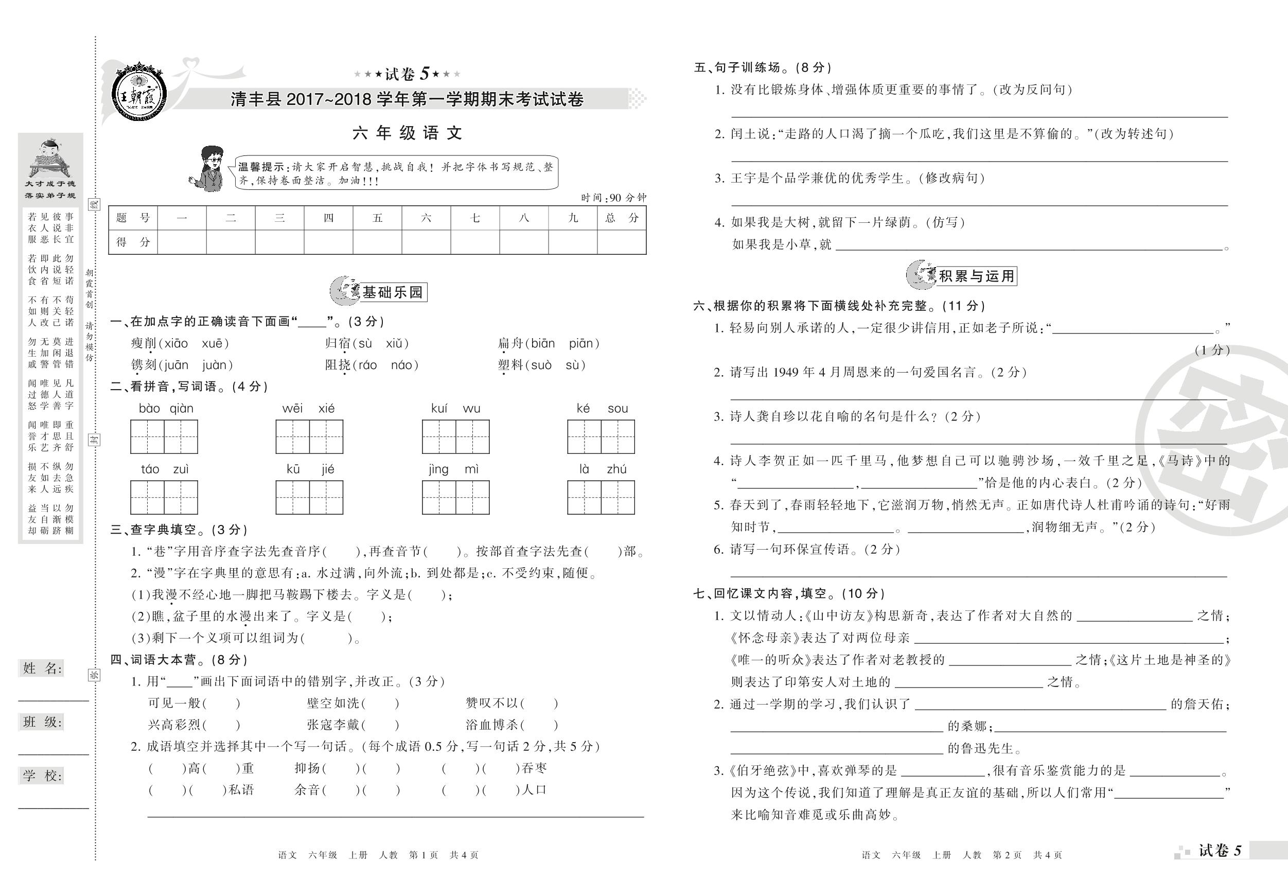 2017-2018学年第一学期濮阳市清丰县六年级语文试卷(人教版)【5】