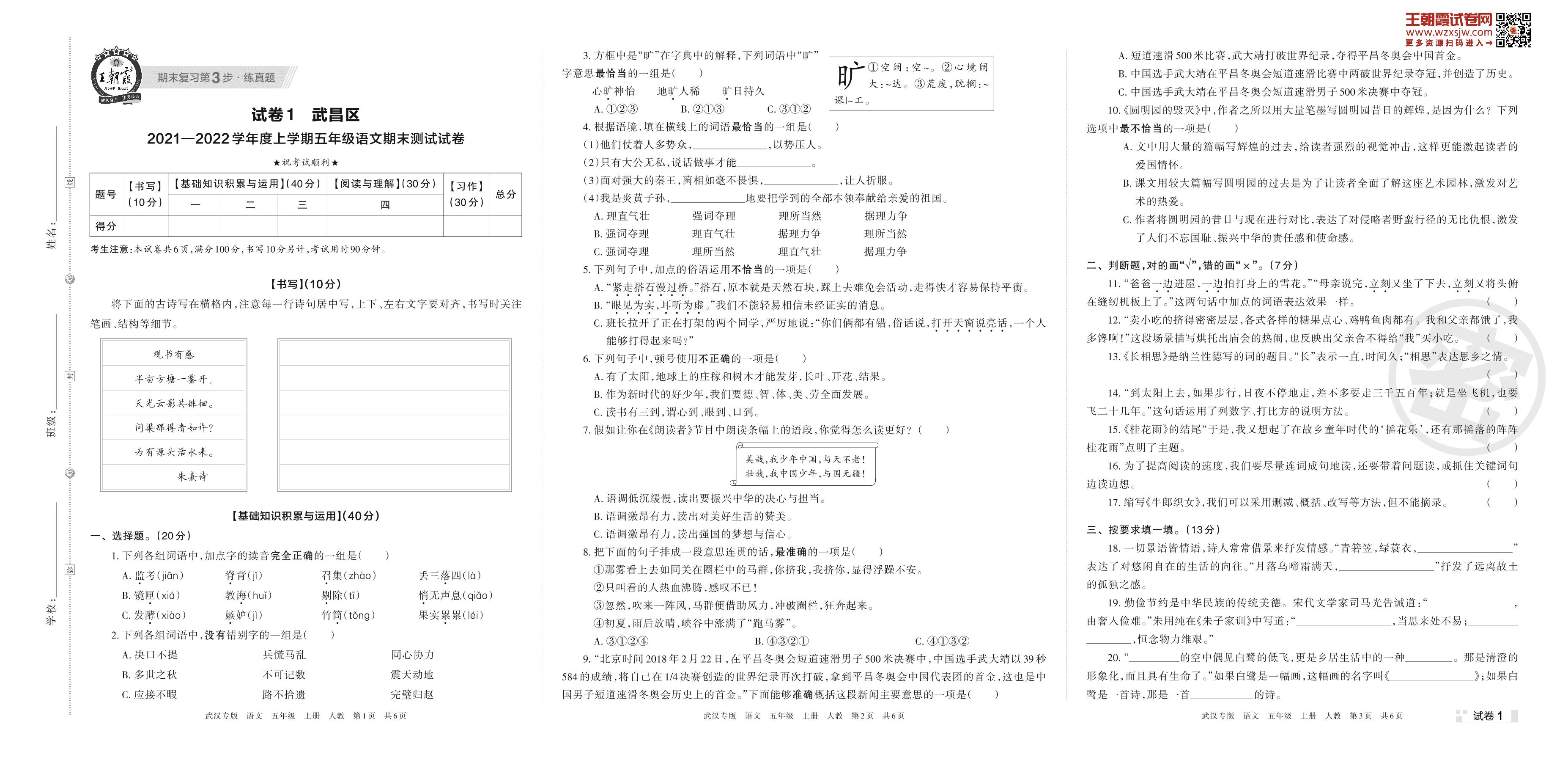 武昌区2021—2022学年度上学期五年级语文期末测试试卷(人教版)【1】
