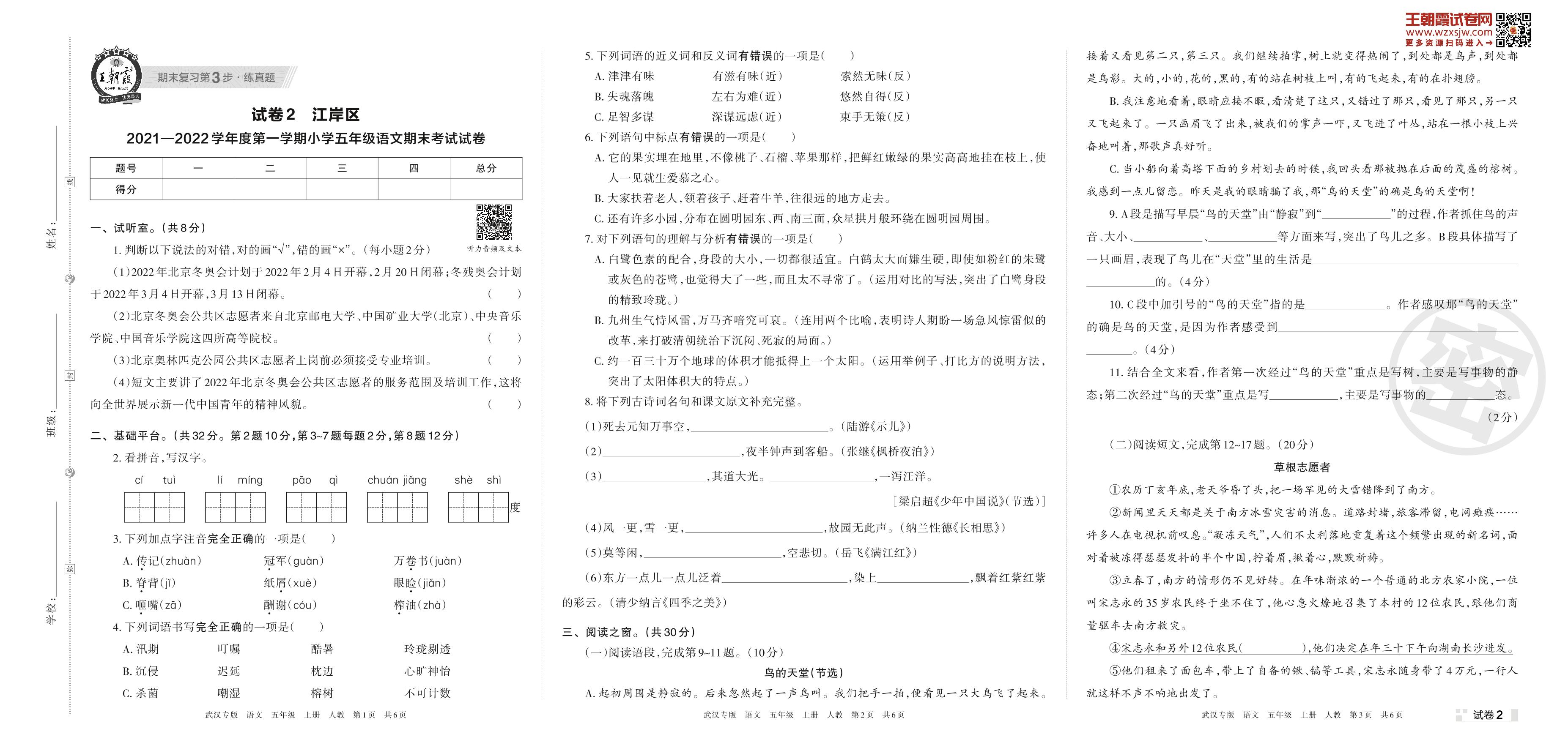 江岸区2021—2022学年度第一学期小学五年级语文期末考试试卷(人教版)【2】