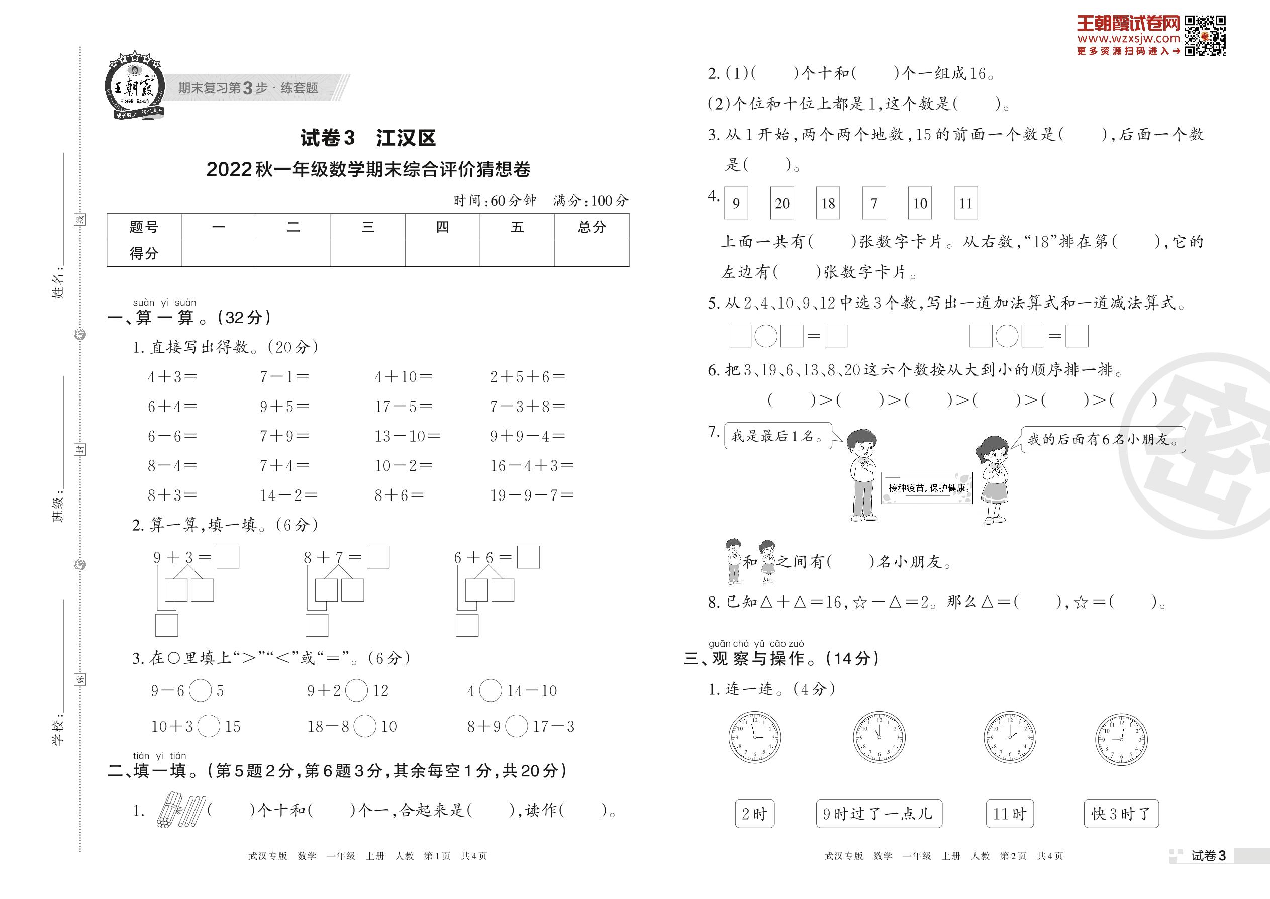 江汉区2022秋一年级数学期末综合评价猜想卷(人教版)【3】