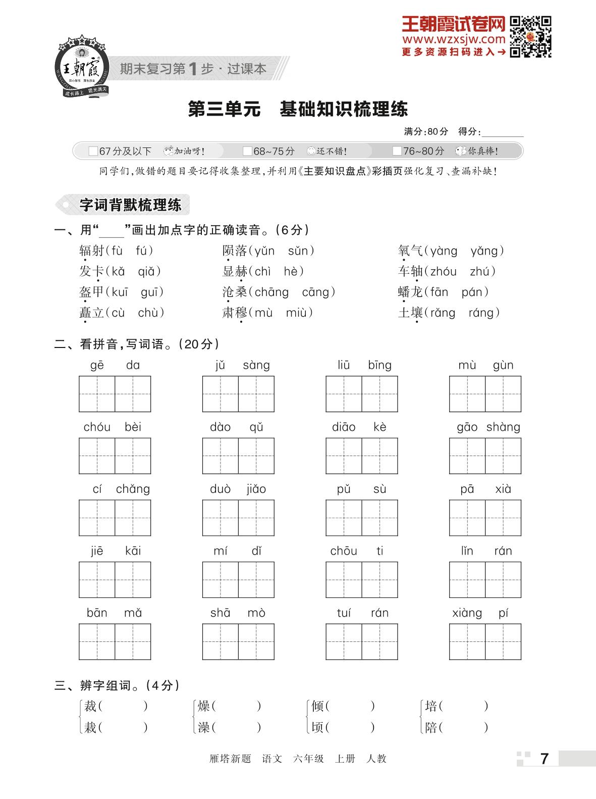 王朝霞期末过课本——第三单元 基础知识梳理练六年级上册语文(人教版)_R221123153158133