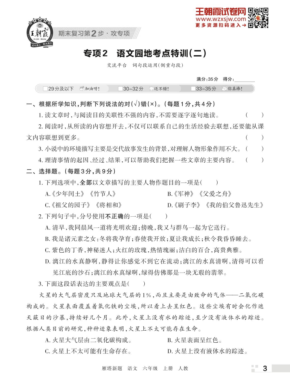 王朝霞期末专项卷——语文园地考点特训(二)六年级上册语文(人教版)_R221123153159463【2】