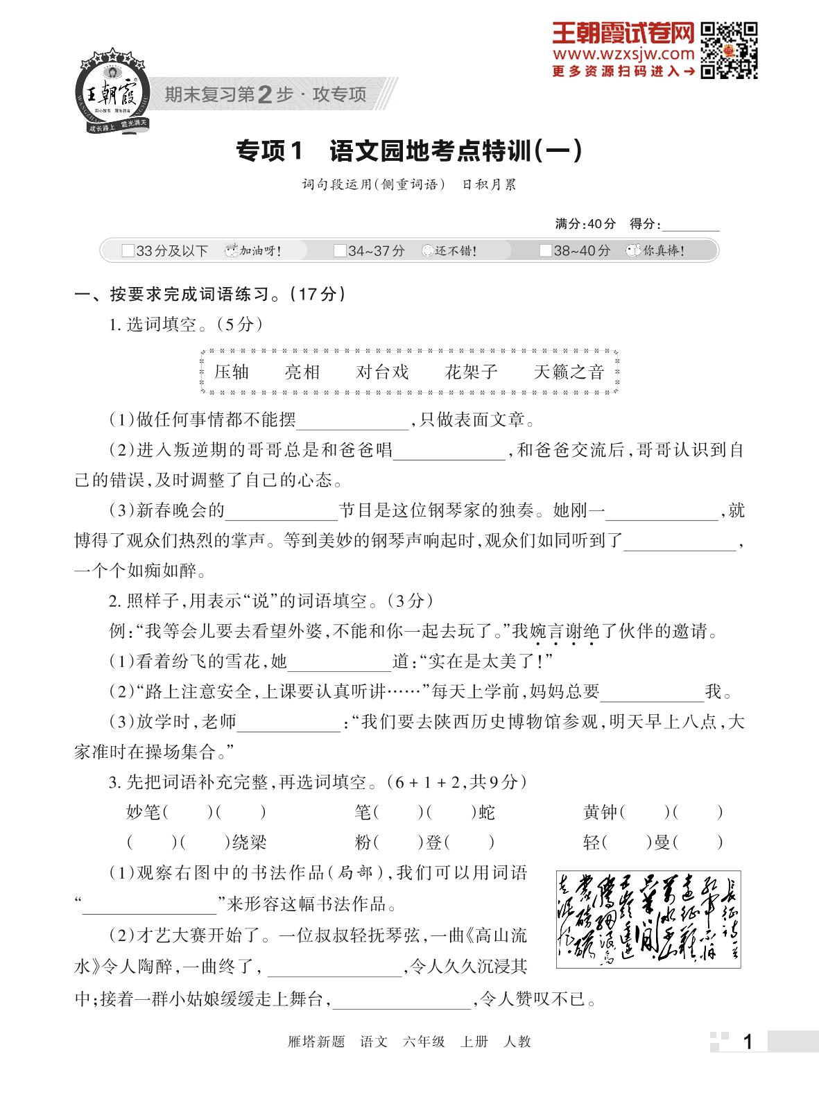 王朝霞期末专项卷——语文园地考点特训(一)六年级上册语文(人教版)_R221123153200880【1】