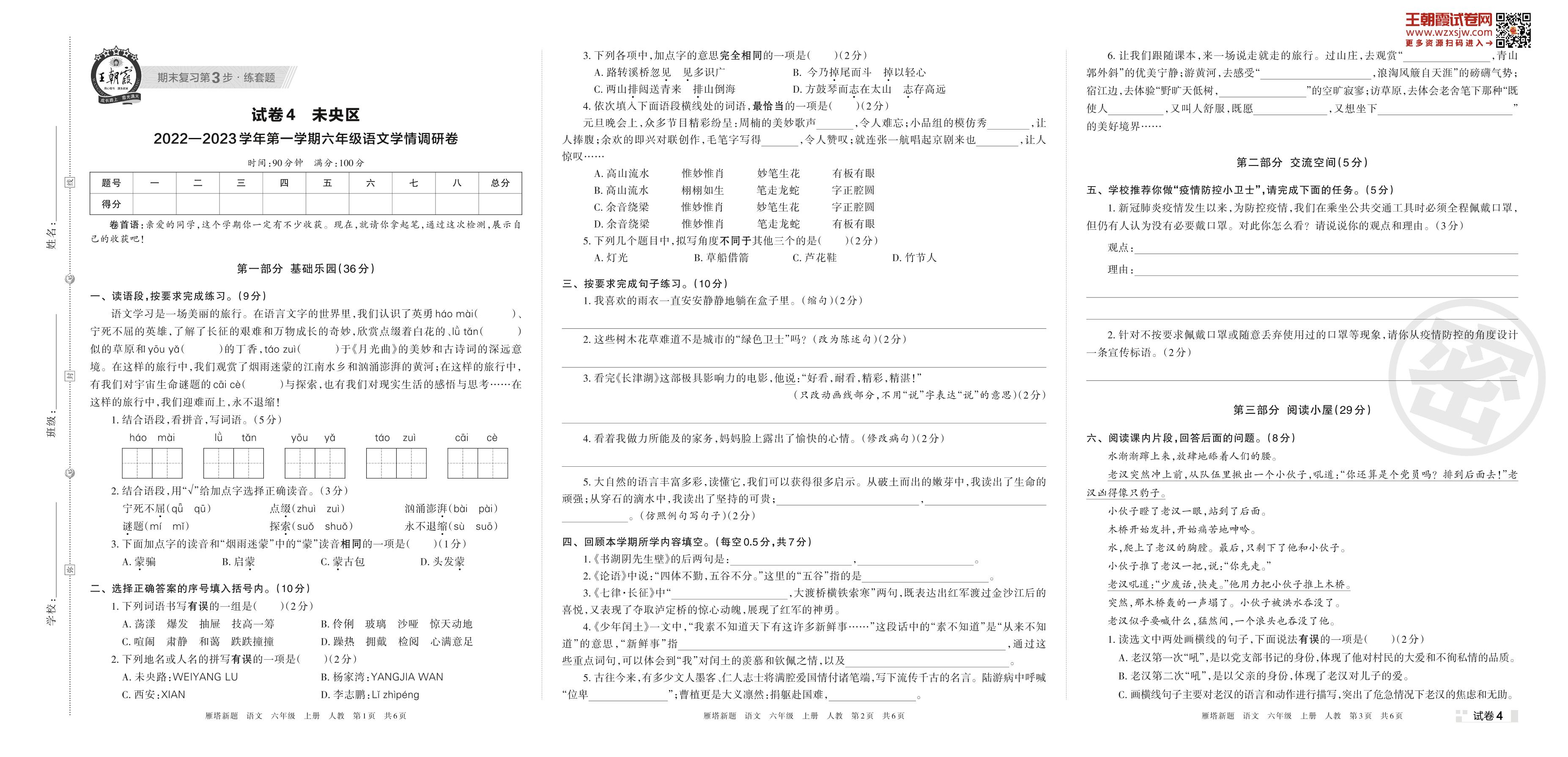 未央区2022—2023学年第一学期学情调研卷六年级上册语文(人教版)【4】