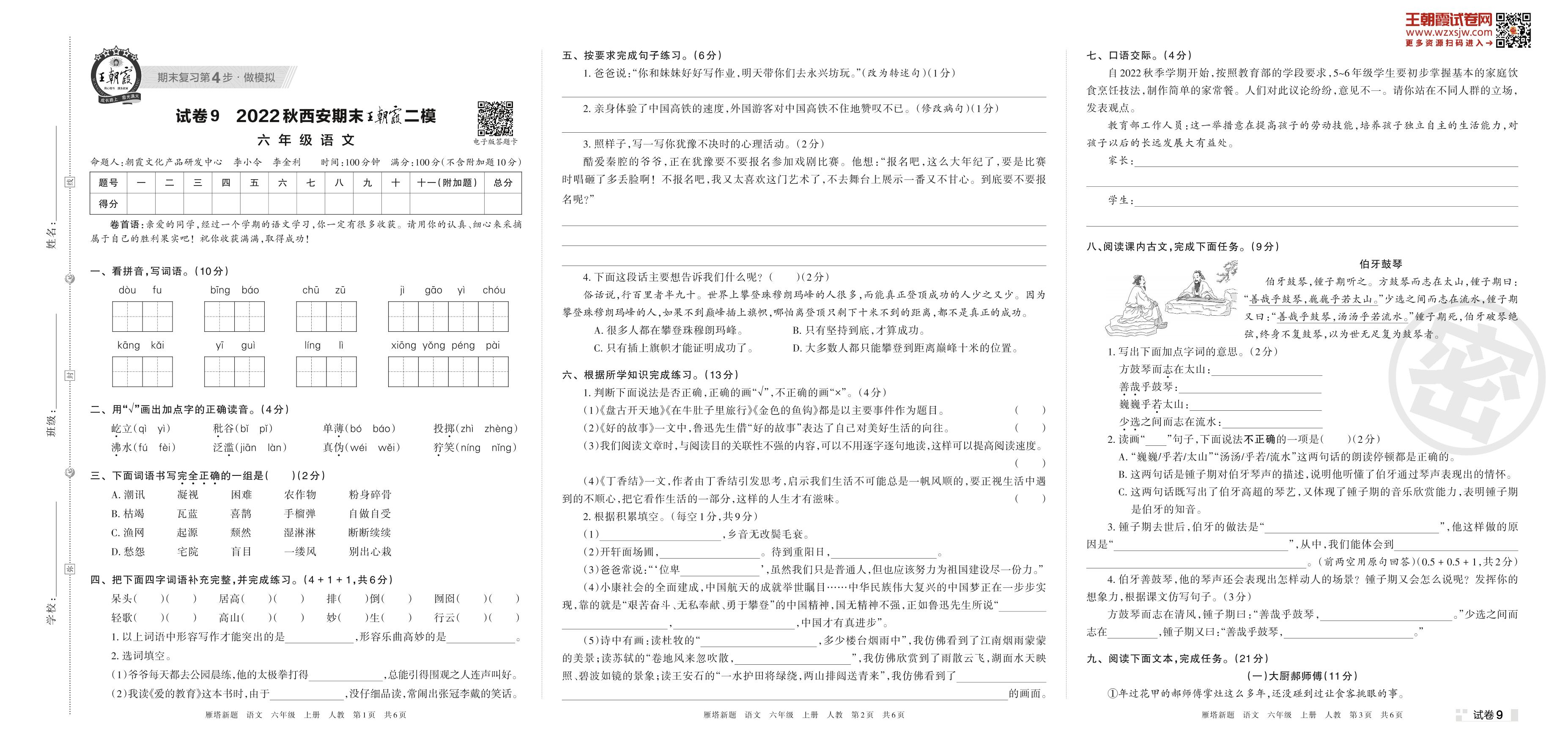 王朝霞期末模拟卷六年级上册语文(人教版)_R221123153201667【9】