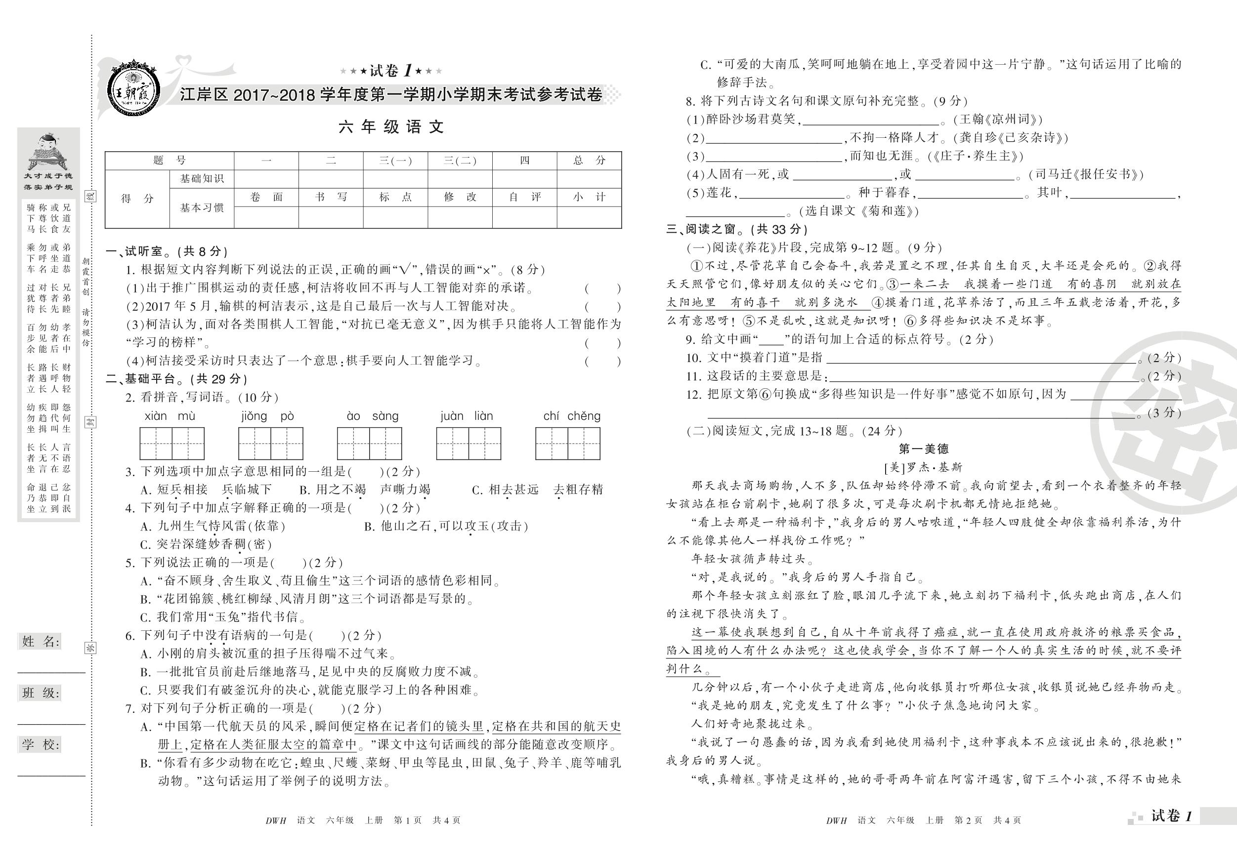 2017-2018学年第一学期武汉市江岸区六年级语文试卷(鄂教版)【1】