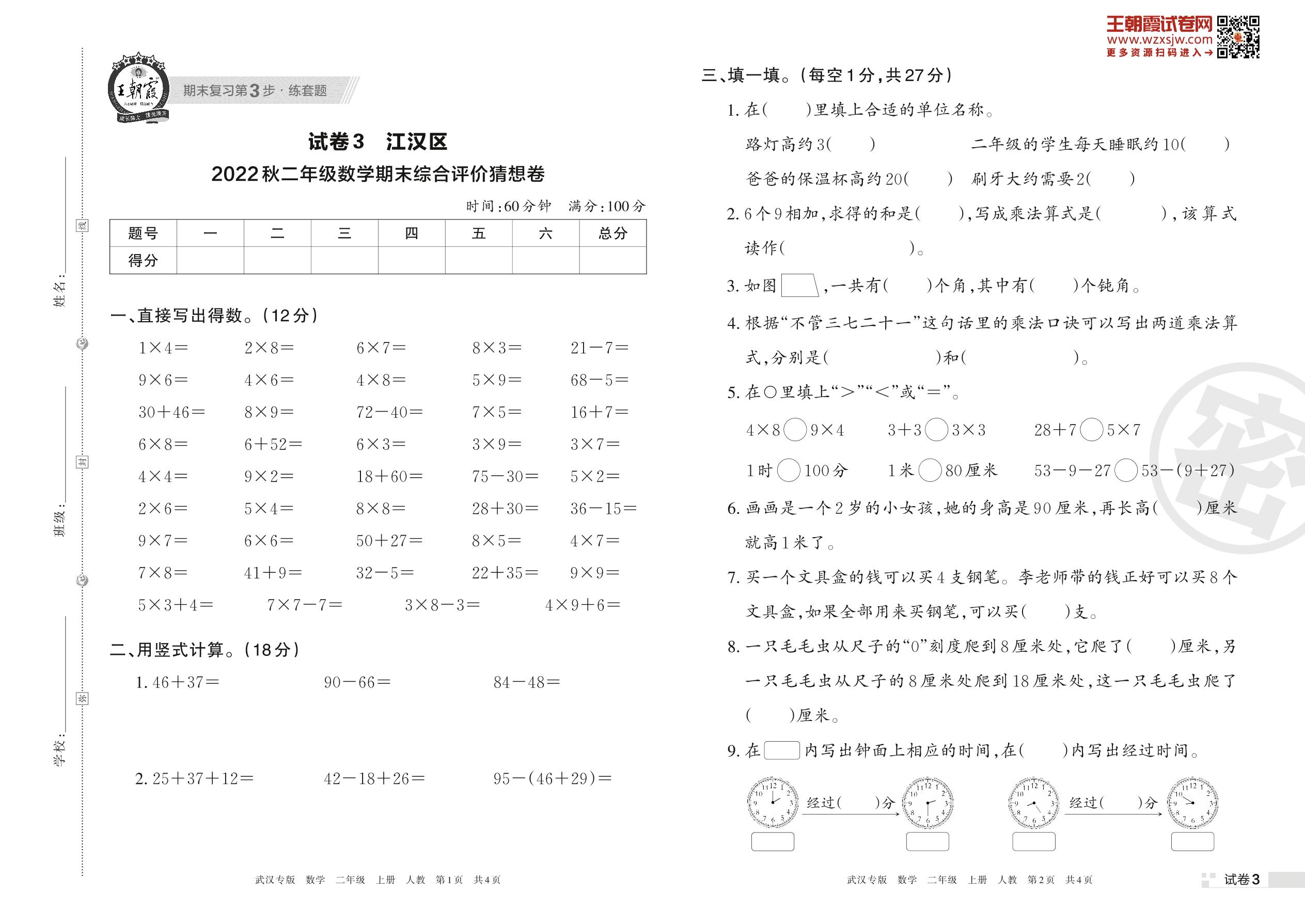 江汉区2022秋期末综合评价猜想卷二年级上册数学(人教版)【3】