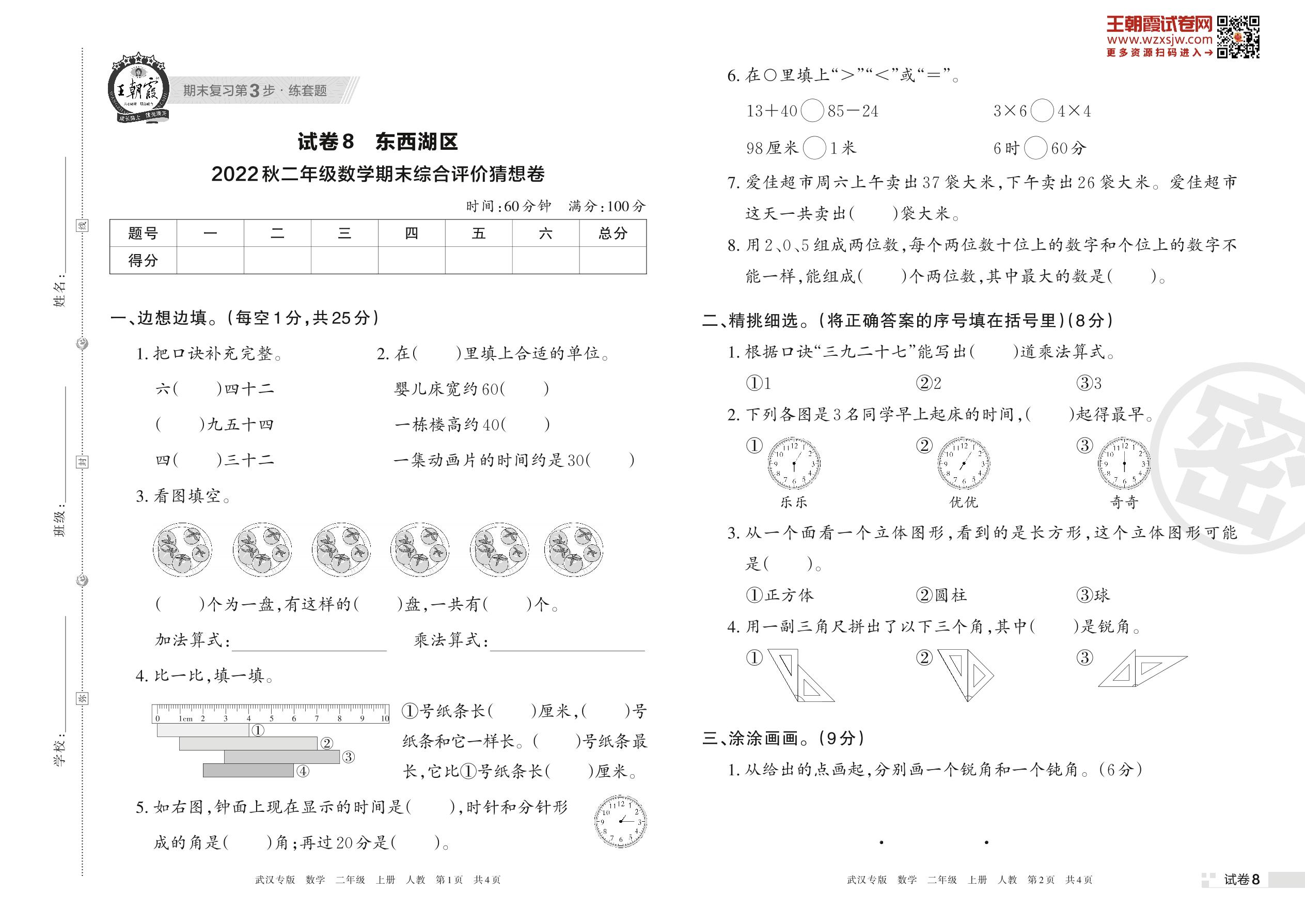 东西湖区2022秋期末综合评价猜想卷二年级上册数学(人教版)【8】
