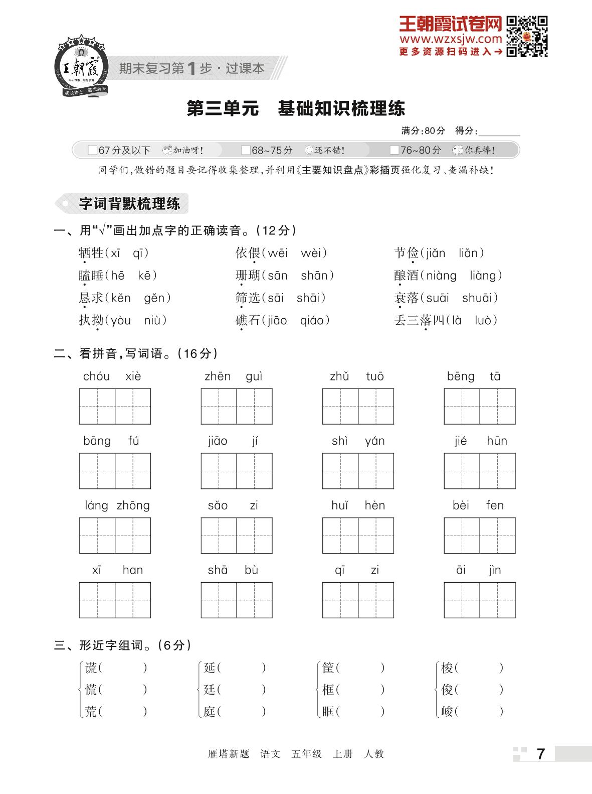 王朝霞期末过课本——第三单元 基础知识梳理练五年级上册语文(人教版)_R221123154631149