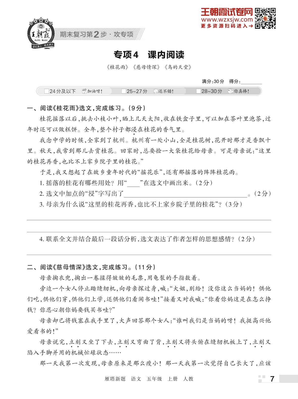 王朝霞期末专项卷——课内阅读五年级上册语文(人教版)【4】