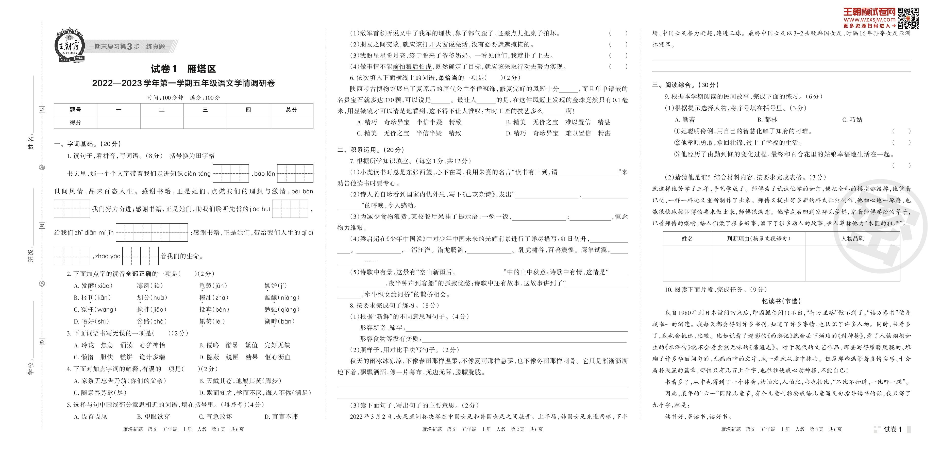 雁塔区2022—2023学年第一学期学情调研卷五年级上册语文(人教版)【1】