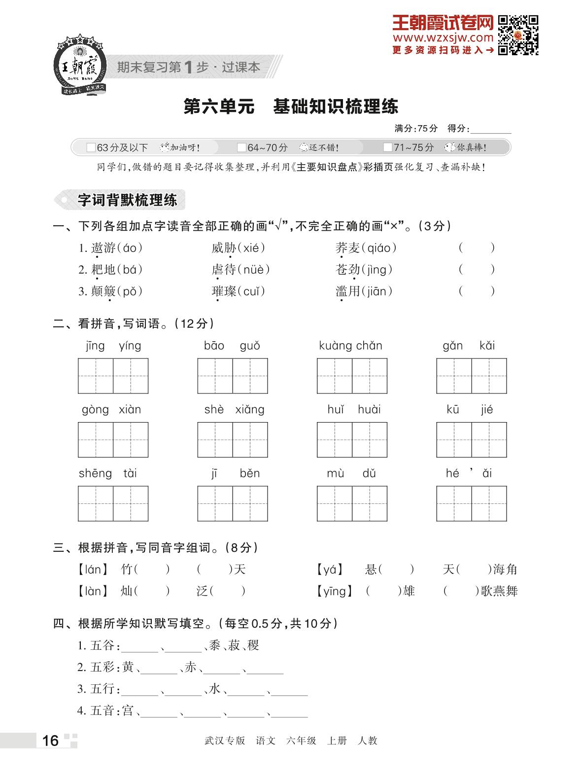 王朝霞期末过课本——第六单元 基础知识梳理练六年级上册语文(人教版)_R221123155104808