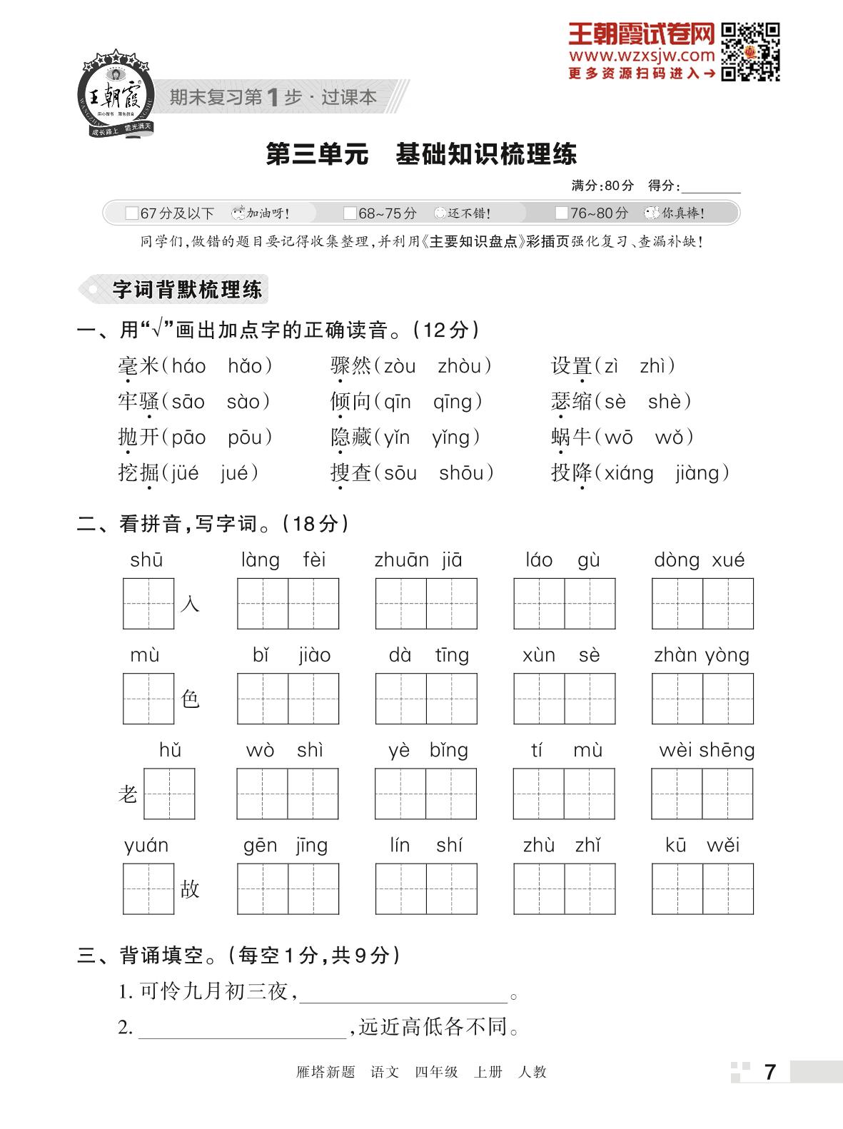 王朝霞期末过课本——第三单元 基础知识梳理练四年级上册语文(人教版)_R221123155633064