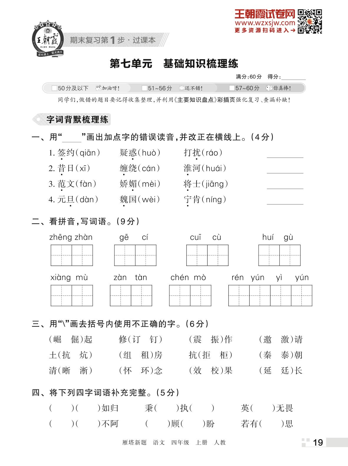 王朝霞期末过课本——第七单元 基础知识梳理练四年级上册语文(人教版)_R221123155633862