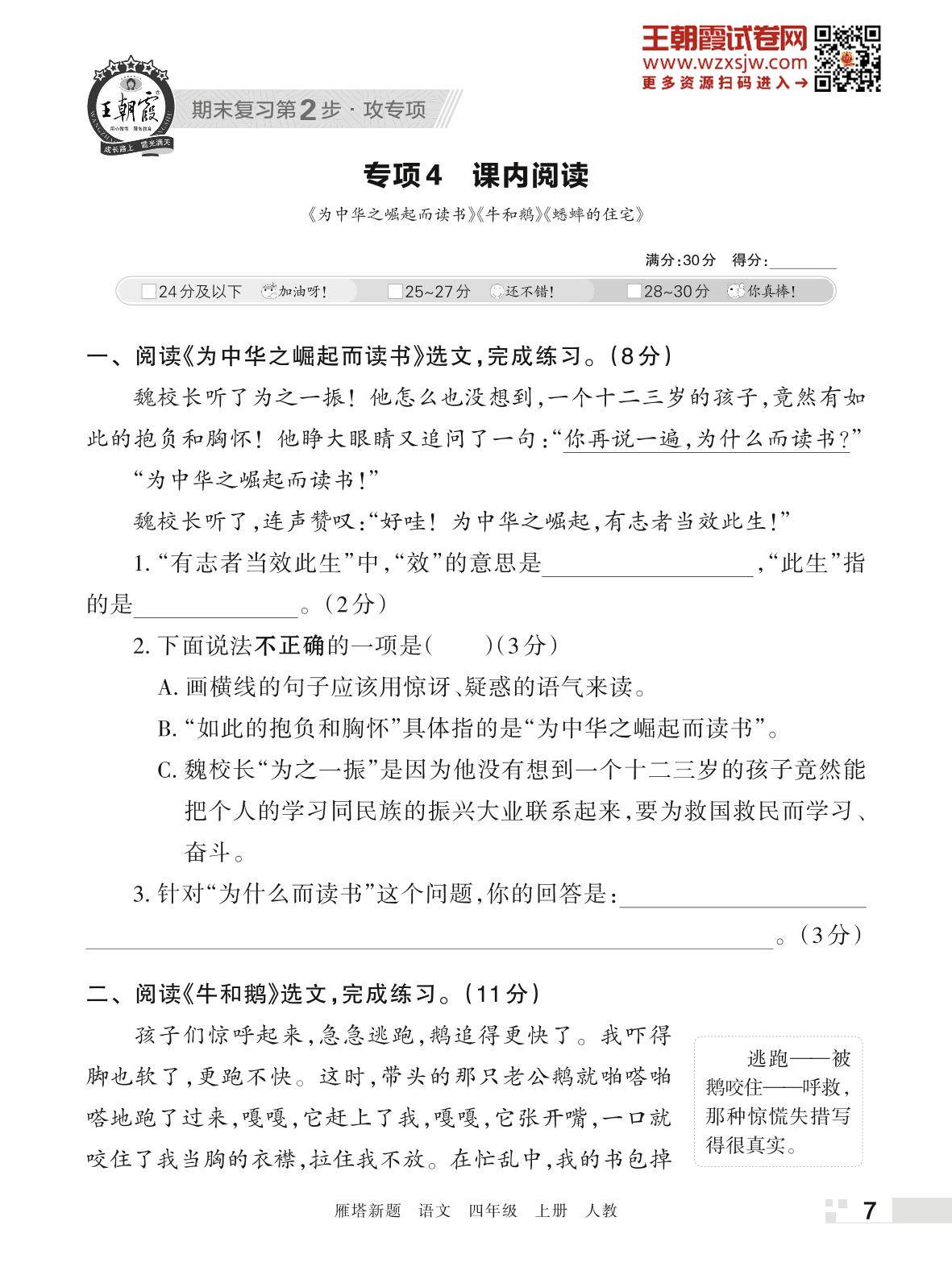 王朝霞期末专项卷——课内阅读四年级上册语文(人教版)【4】