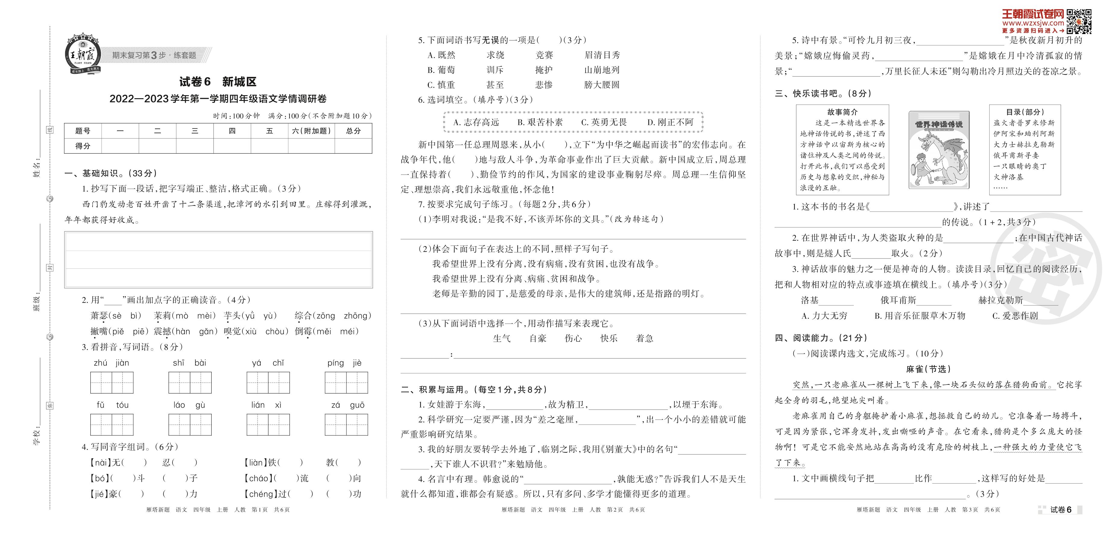 新城区2022—2023学年第一学期学情调研卷四年级上册语文(人教版)【6】