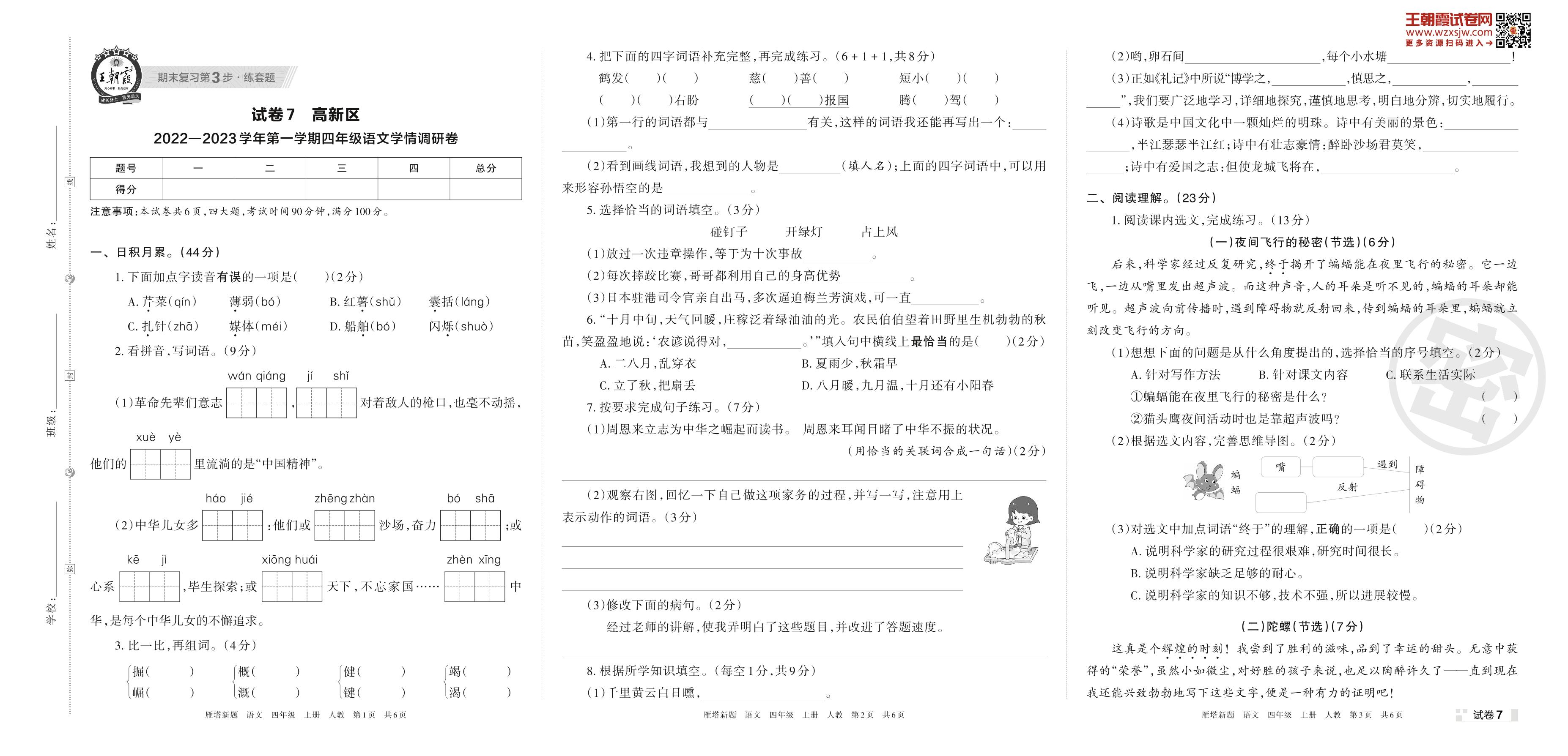 高新区2022—2023学年第一学期学情调研卷四年级上册语文(人教版)【7】