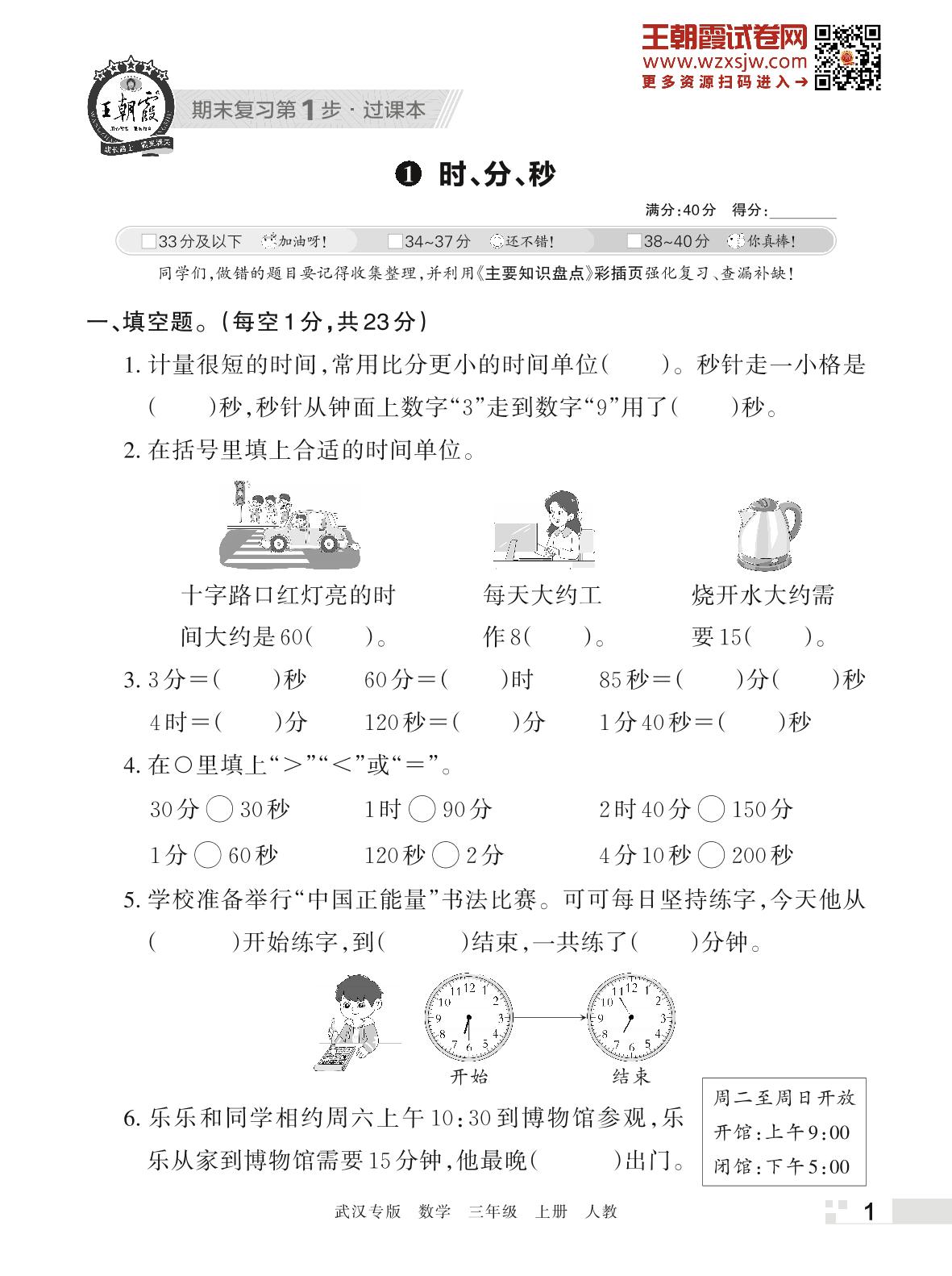 王朝霞期末过课本——1 时、分、秒三年级数学上册(人教版)