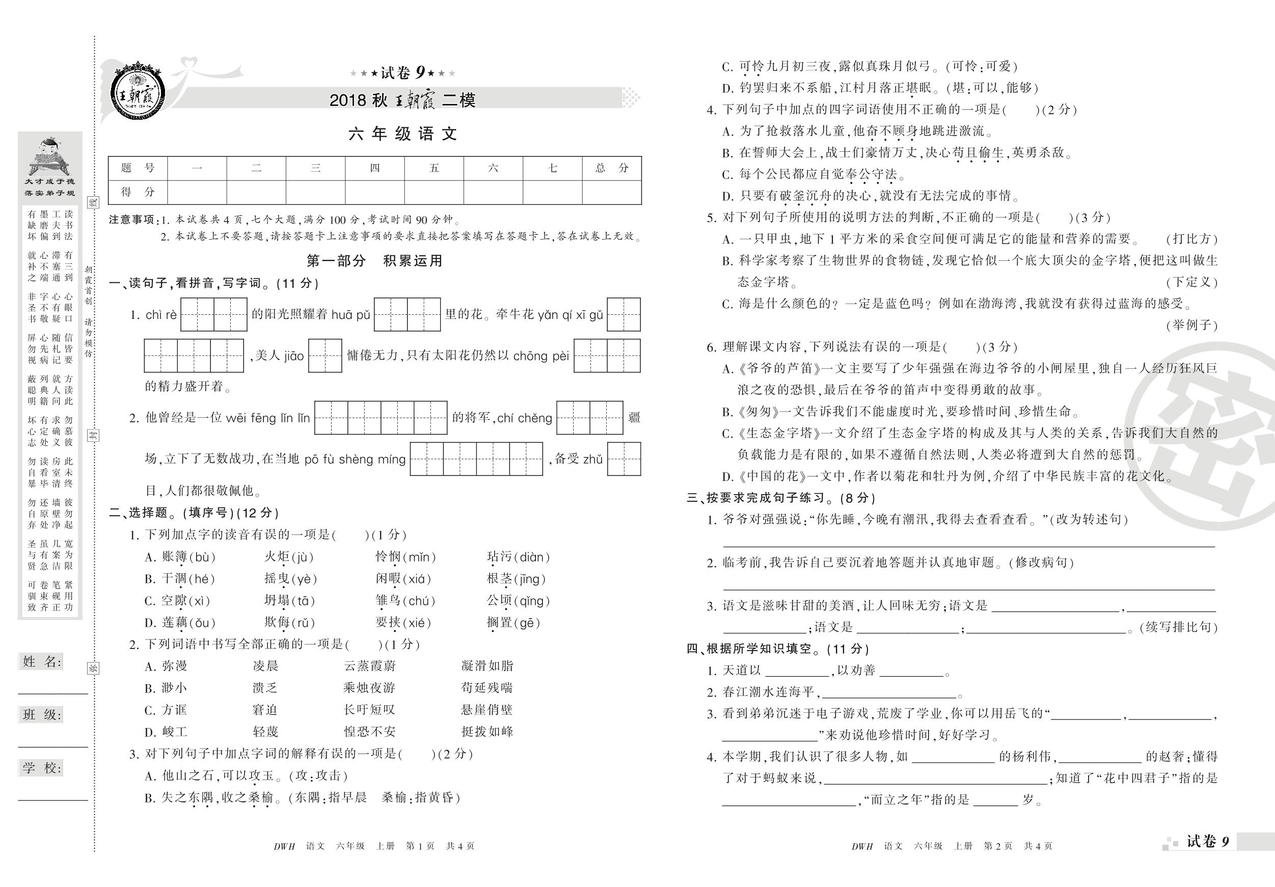 王朝霞期末模拟卷六年级上册语文(鄂教版)【9】
