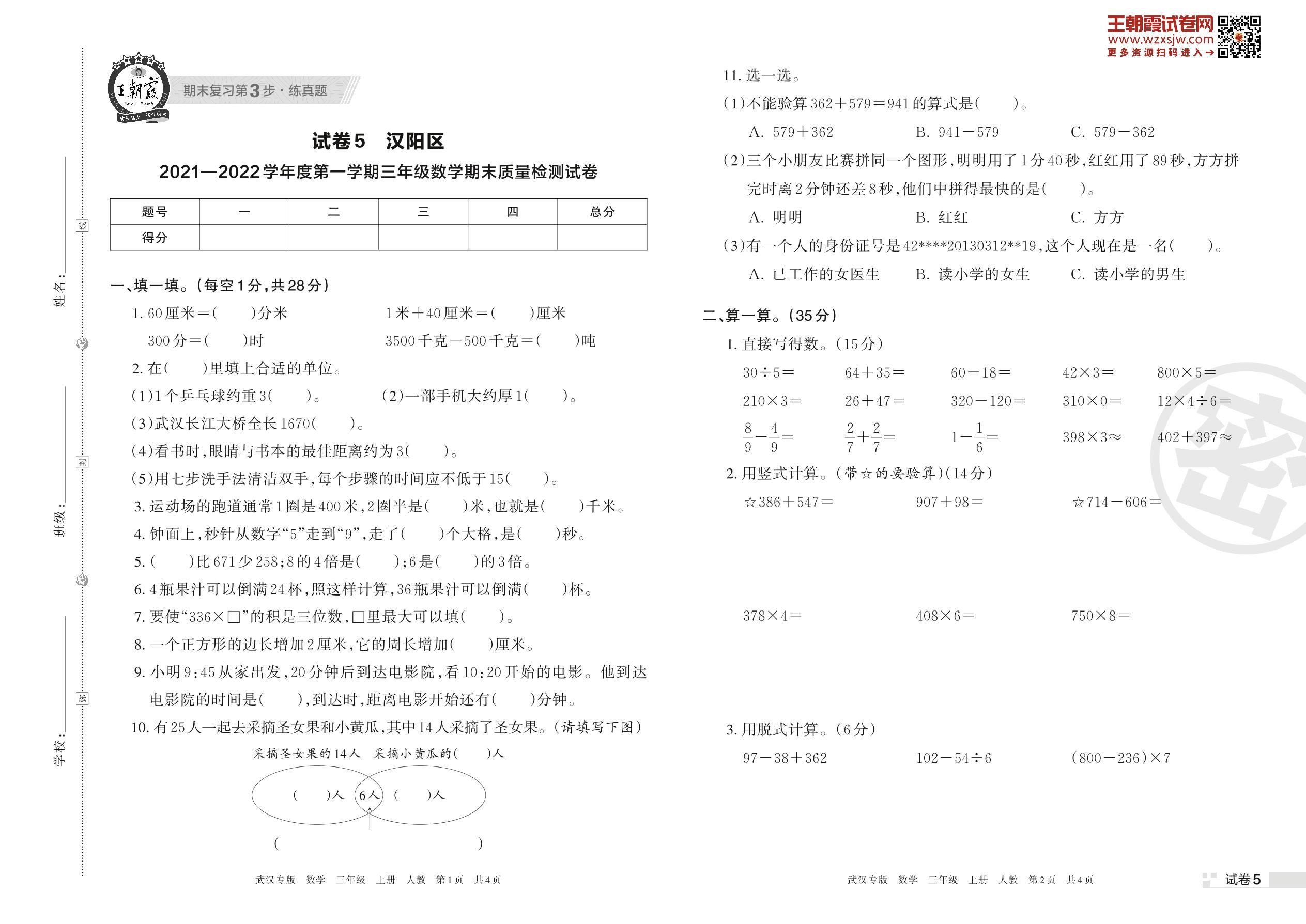 汉阳区2021—2022学年度第一学期三年级数学期末质量监测试卷(人教版)【5】