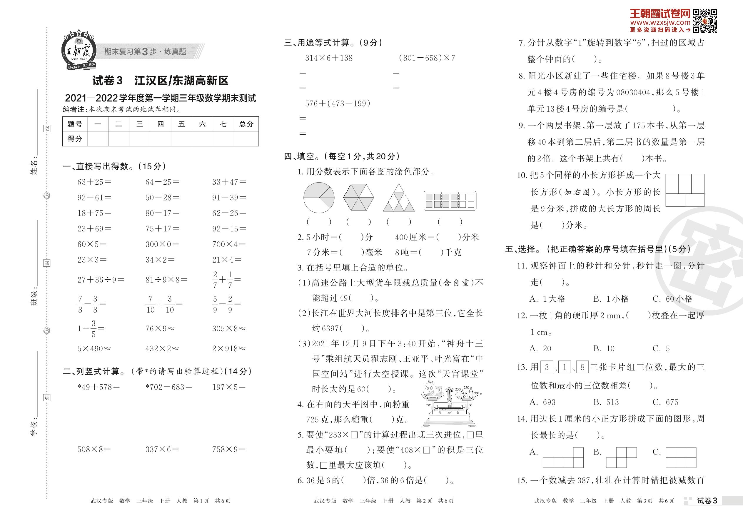 江汉区、东湖高新区2021—2022学年度第一学期三年级数学期末测试(人教版)【3】