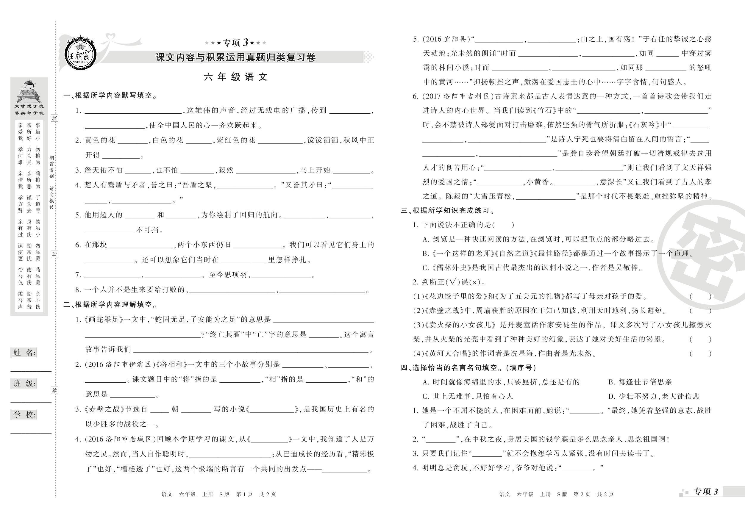 王朝霞期末专项卷——课文内容与积累运用、课内阅读与写作真题归类复习卷六年级上册语文(S版)_R210802115510【0】