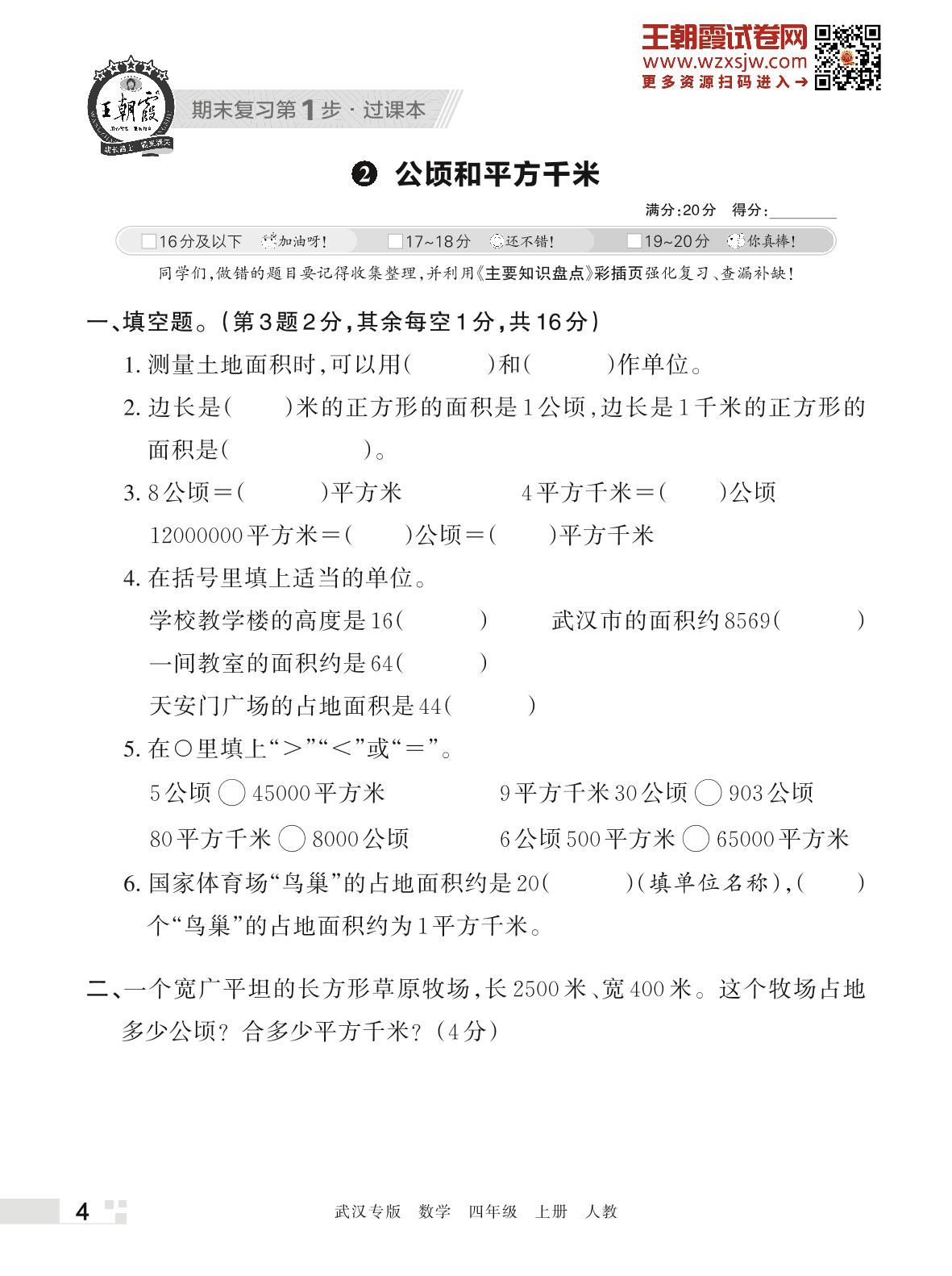 王朝霞期末过课本——2 公顷和平方千米四年级数学上册(人教版)