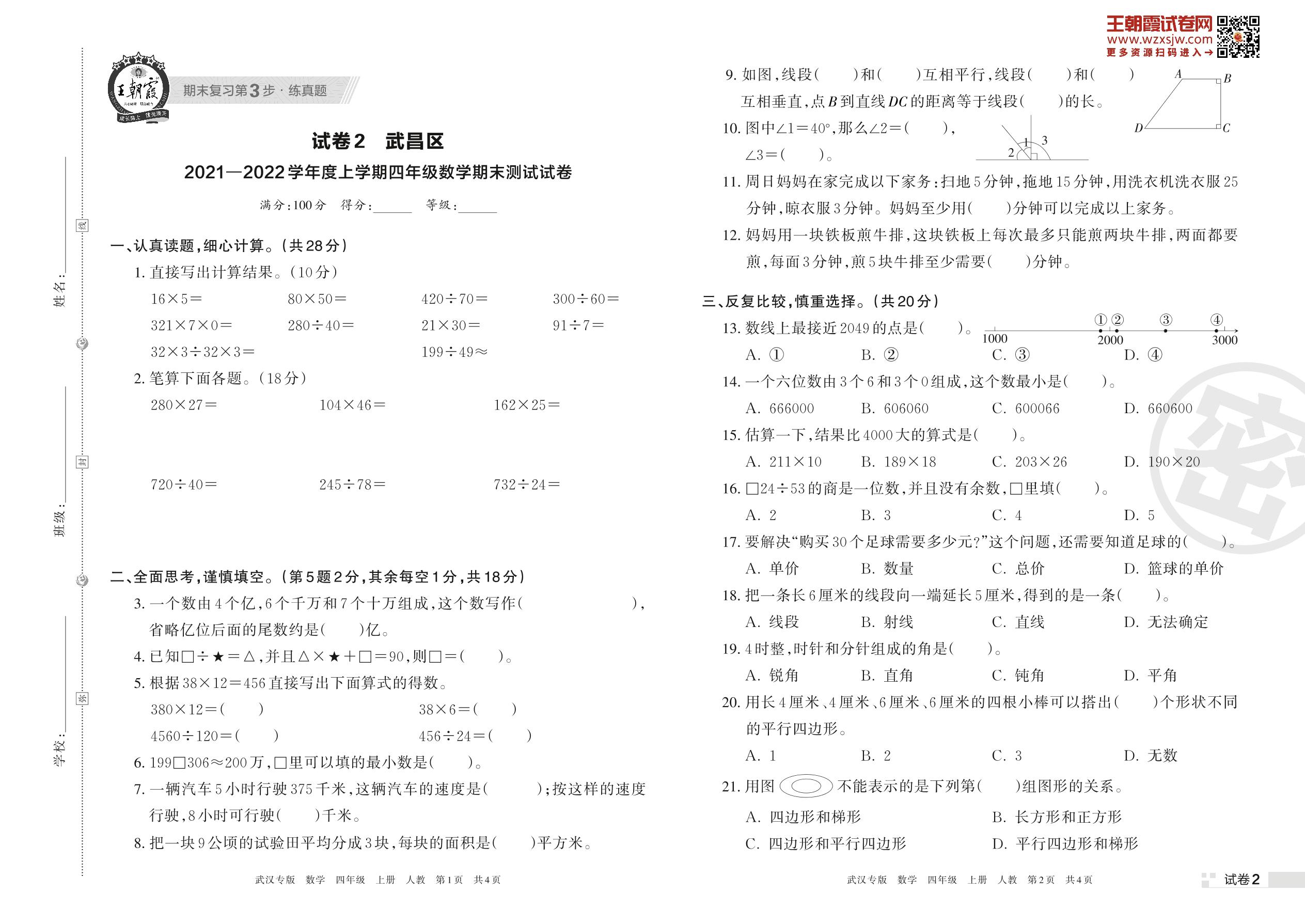 武昌区2021—2022学年度上学期四年级数学期末测试试卷(人教版)【2】