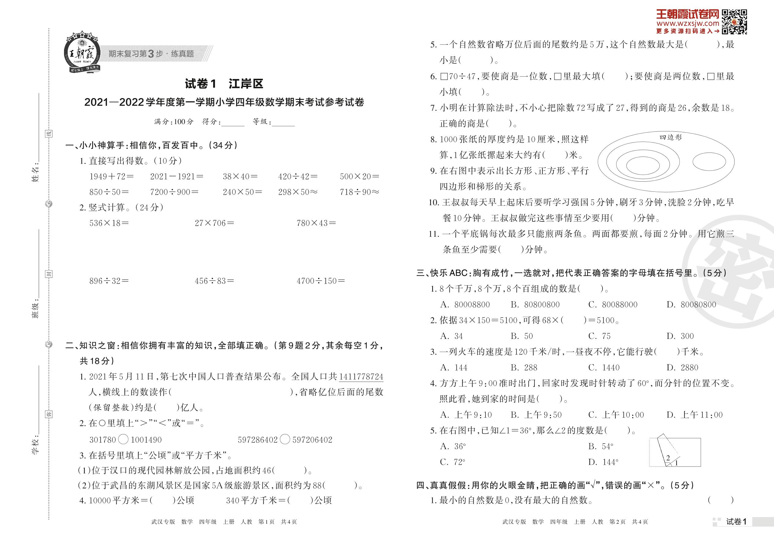 江岸区2021—2022学年度第一学期小学四年级数学期末考试参考试卷(人教版)【1】