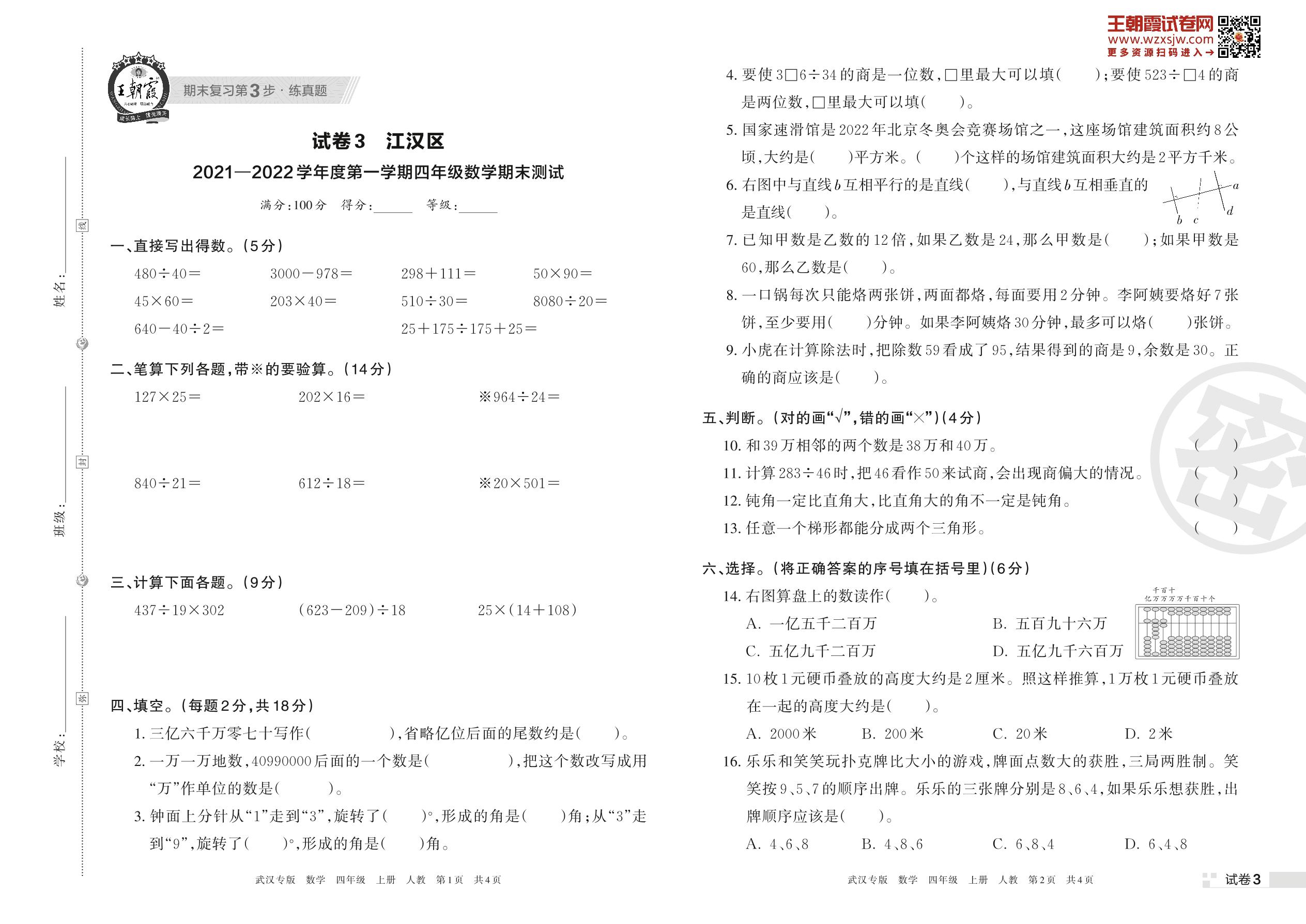 江汉区2021—2022学年度第一学期四年级数学期末测试(人教版)【3】