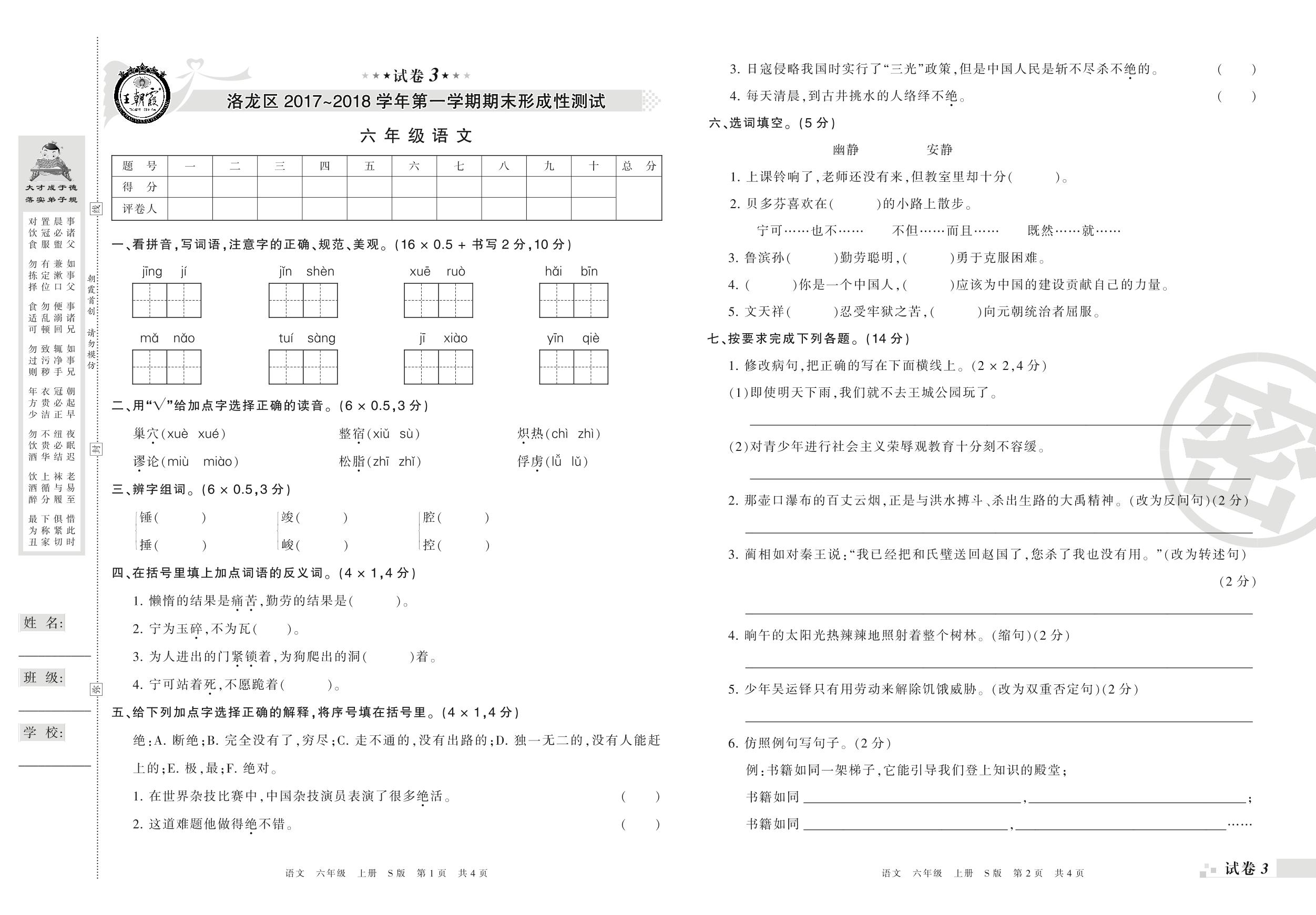 2017-2018学年第一学期洛阳市洛龙区六年级语文试卷(S版)【3】