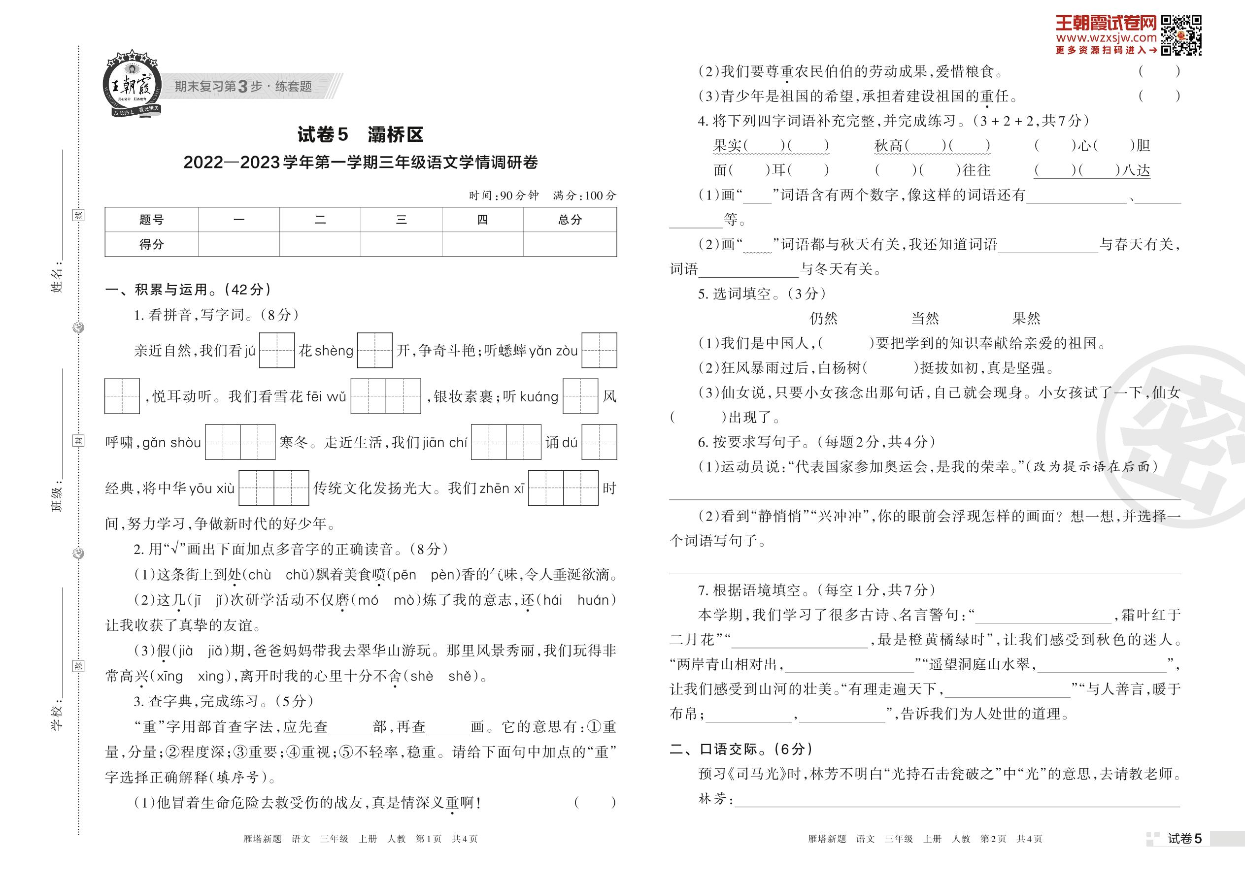 灞桥区2022—2023学年第一学期学情调研卷三年级上册语文(人教版)【5】