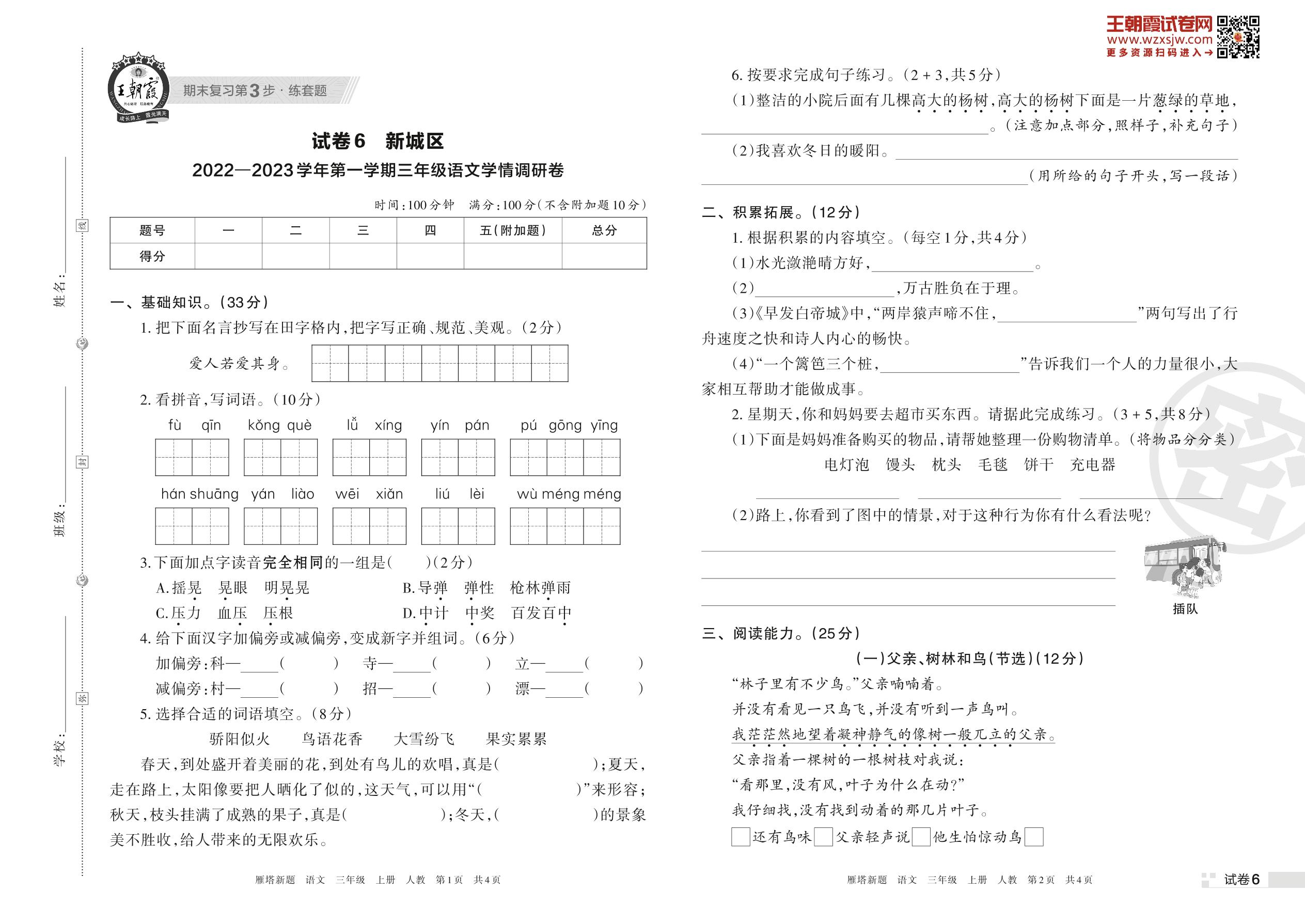 新城区2022—2023学年第一学期学情调研卷三年级上册语文(人教版)【6】
