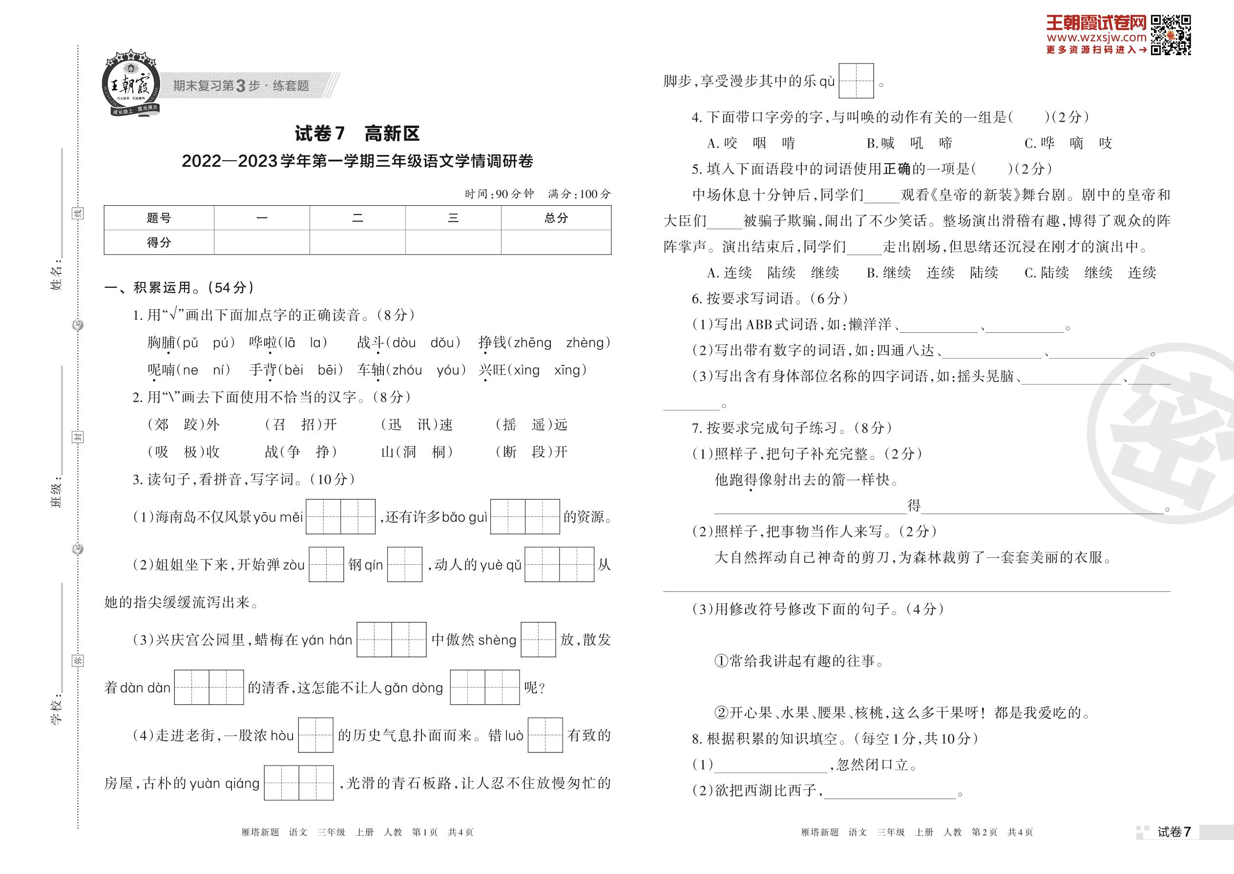 高新区2022—2023学年第一学期学情调研卷三年级上册语文(人教版)【7】
