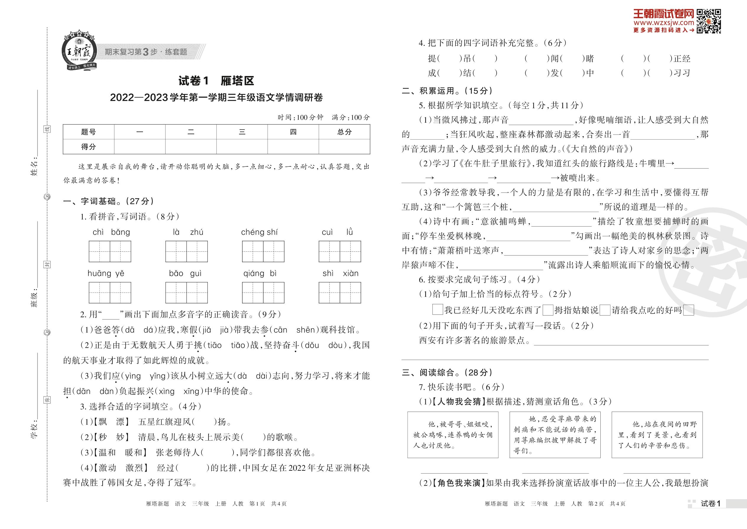 雁塔区2022—2023学年第一学期学情调研卷三年级上册语文(人教版)【1】