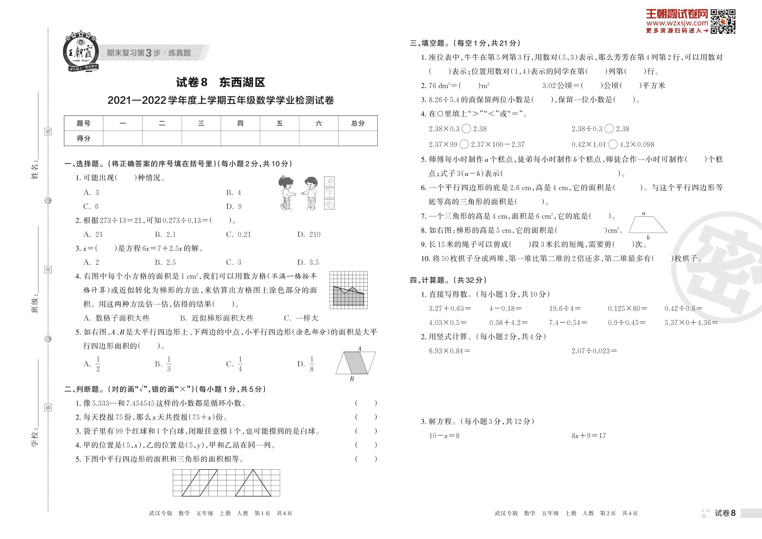东西湖区2021—2022学年度上学期五年级数学学业检测试卷(人教版)【8】