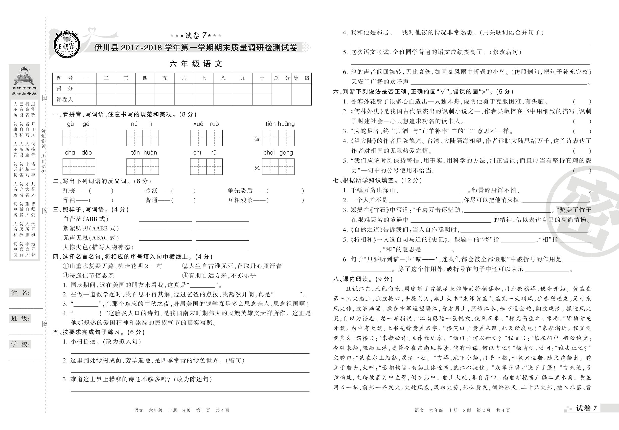 2017-2018学年第一学期洛阳市伊川县六年级语文试卷(S版)【7】