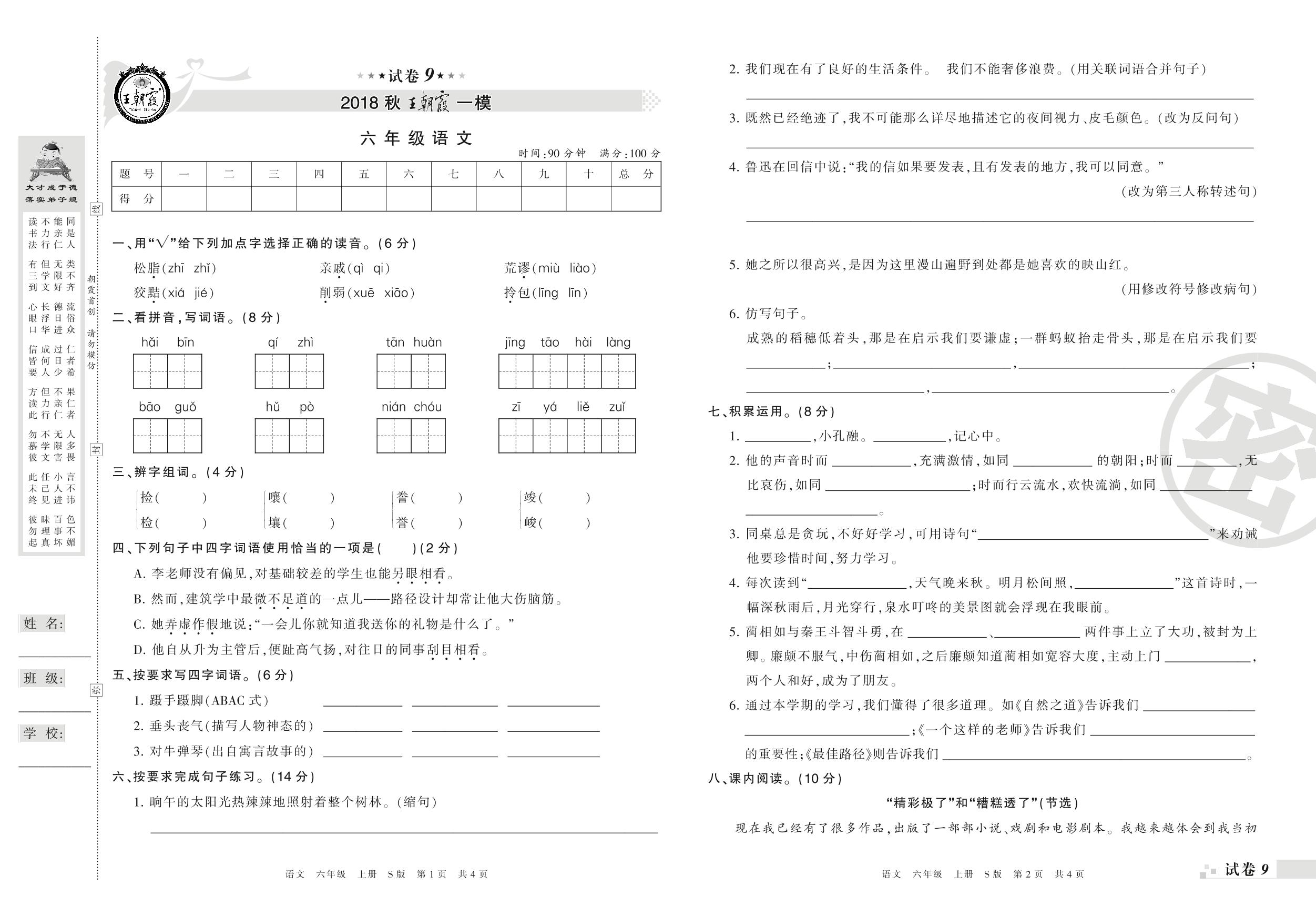 王朝霞期末模拟卷六年级上册语文(S版)_R210802115542【9】
