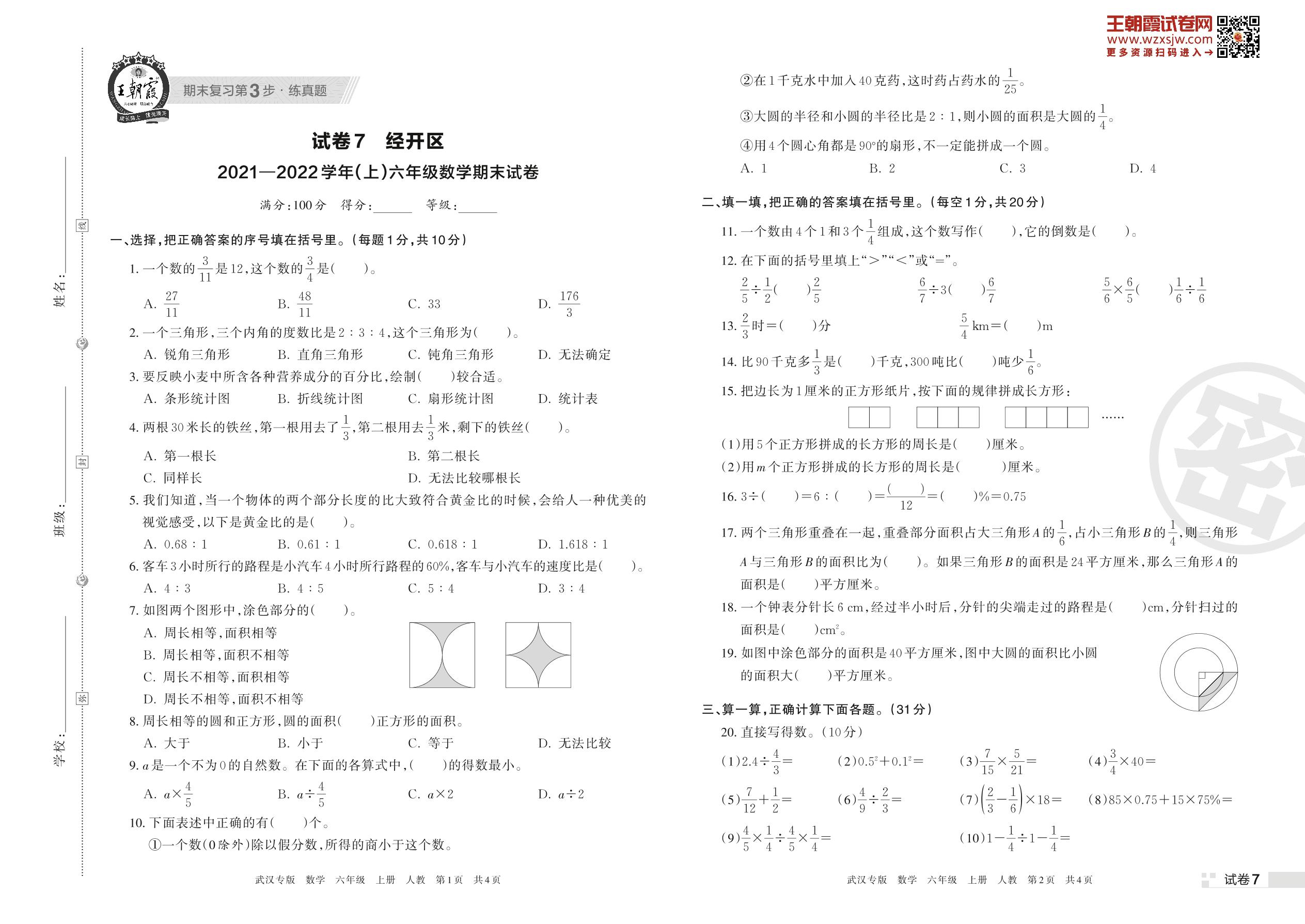 经开区2021-2022学年(上)六年级数学期末试卷(人教版)【7】